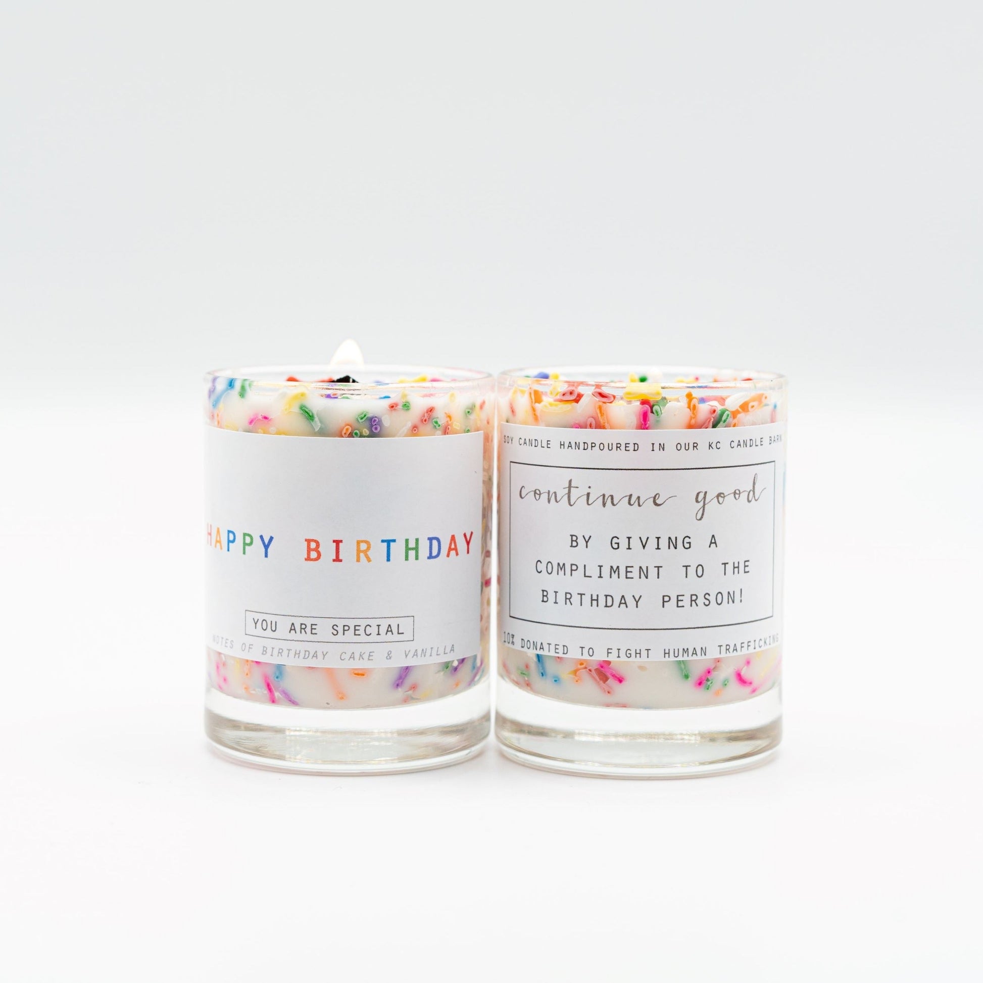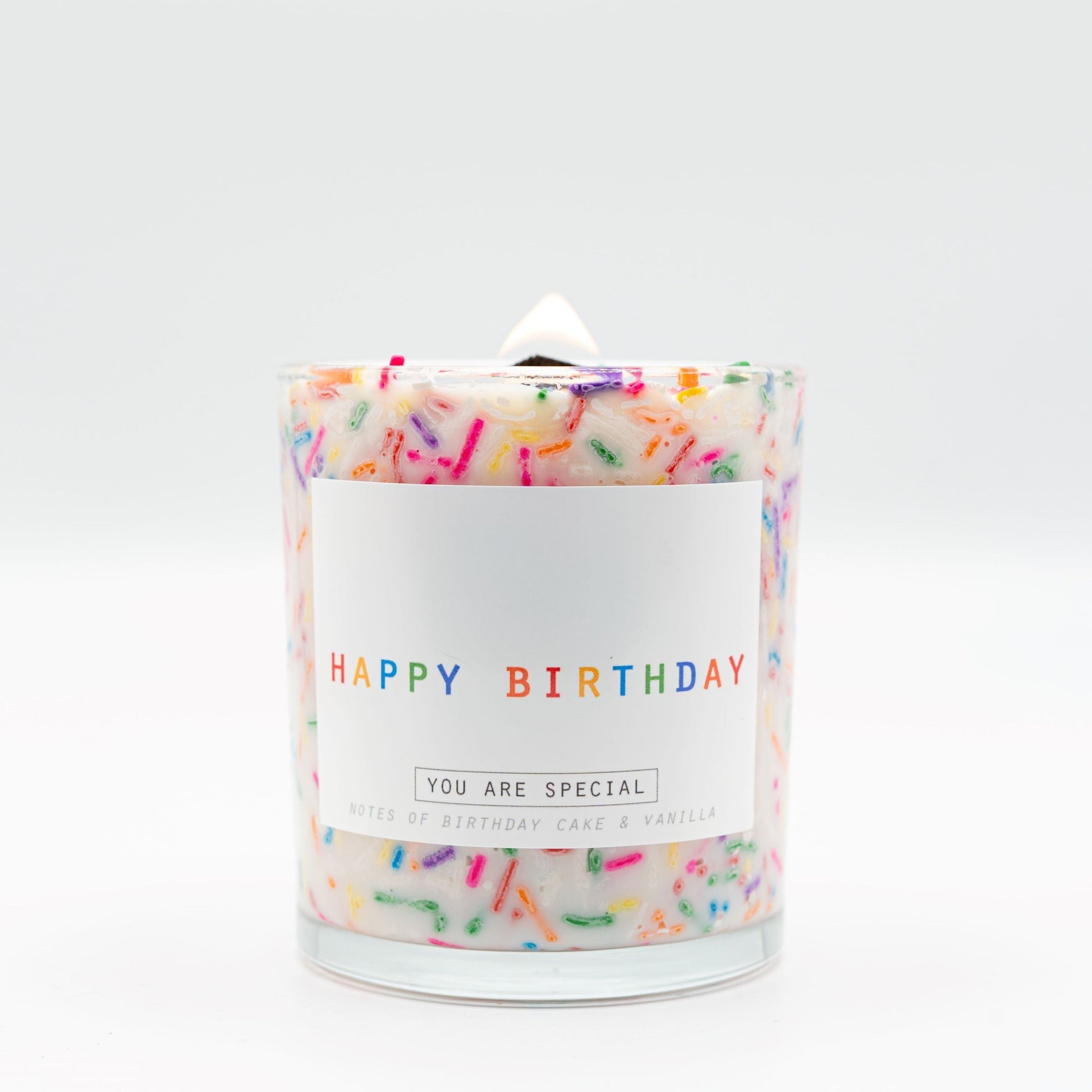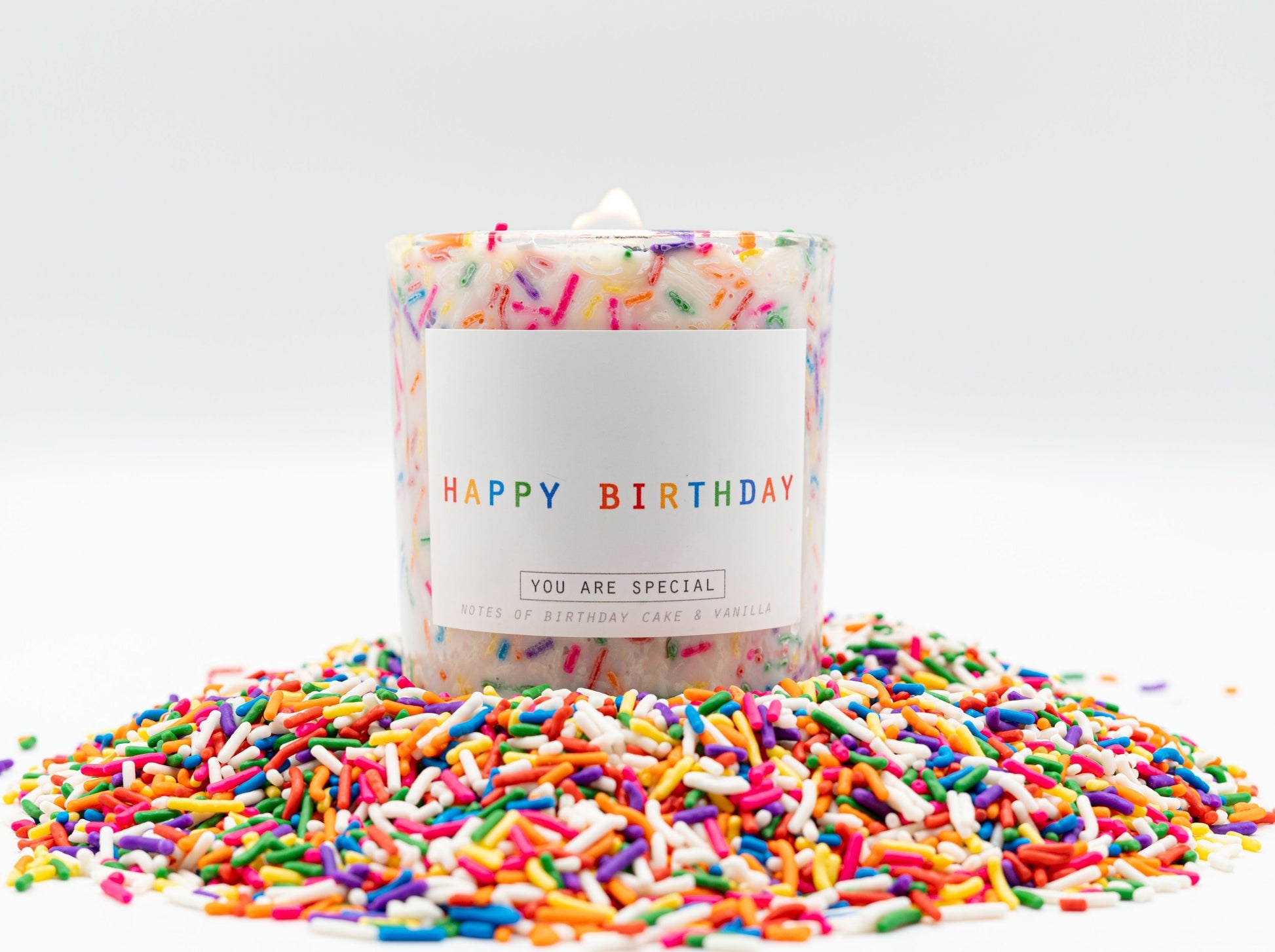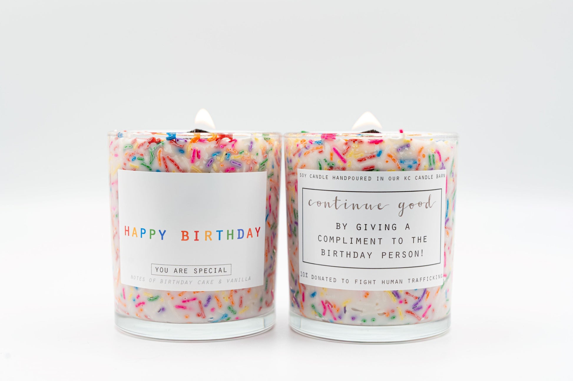A very fitting Birthday gift. :) May this unique candle with real sprinkles inside light up your loved one's life with smiles and good smells! It smells like birthday cake with strong notes of sugar, buttercream, honey, and vanilla. The front label says HAPPY BIRTHDAY and 'you are special'. The back of this candle says 'continue good by giving a compliment to the birthday person!'
