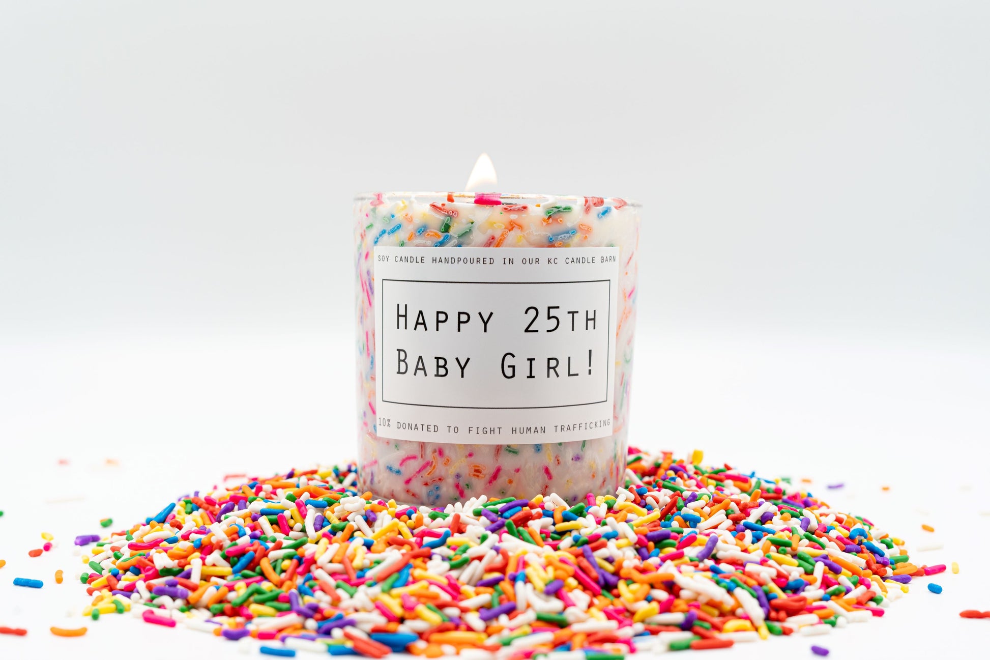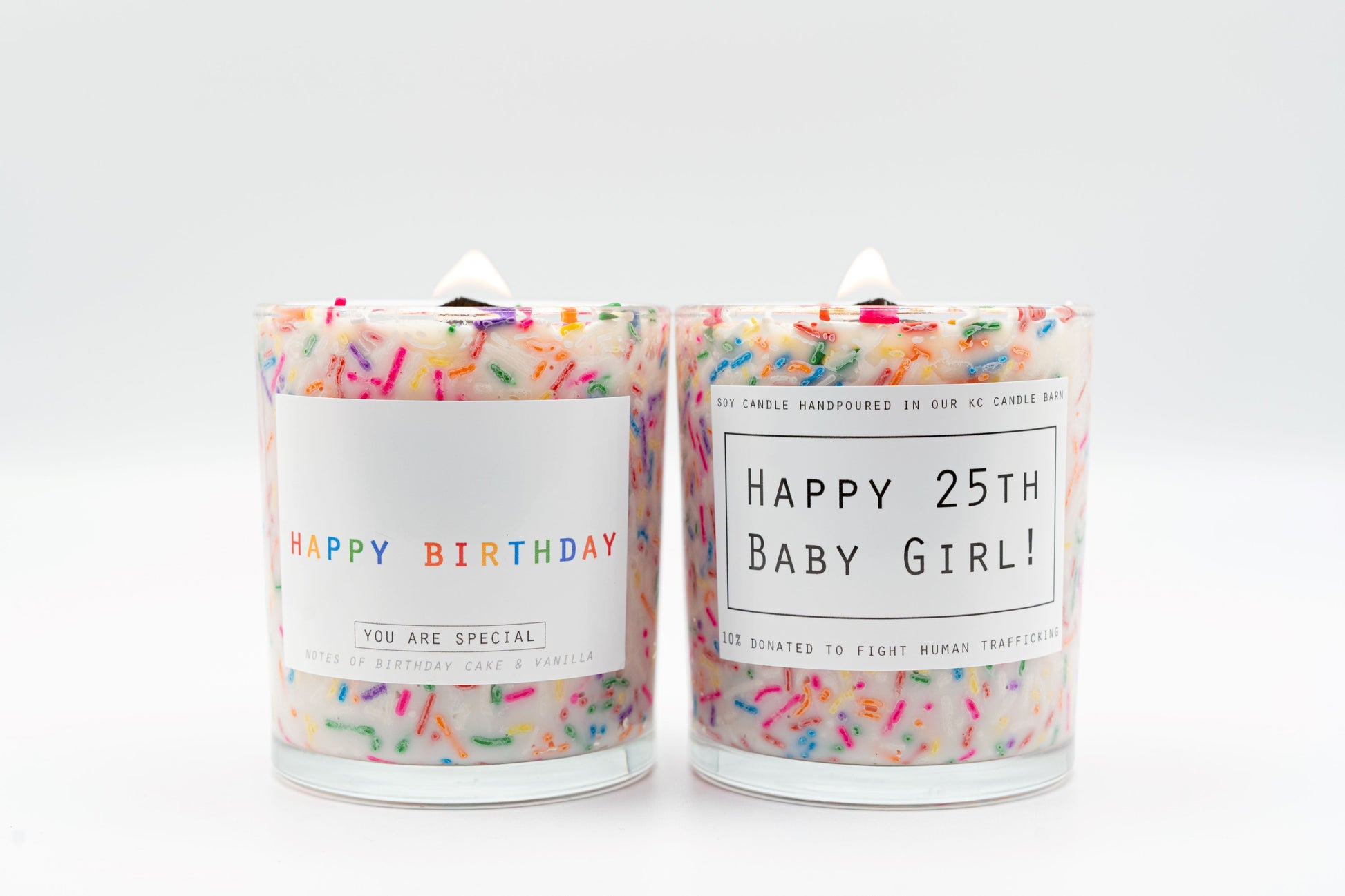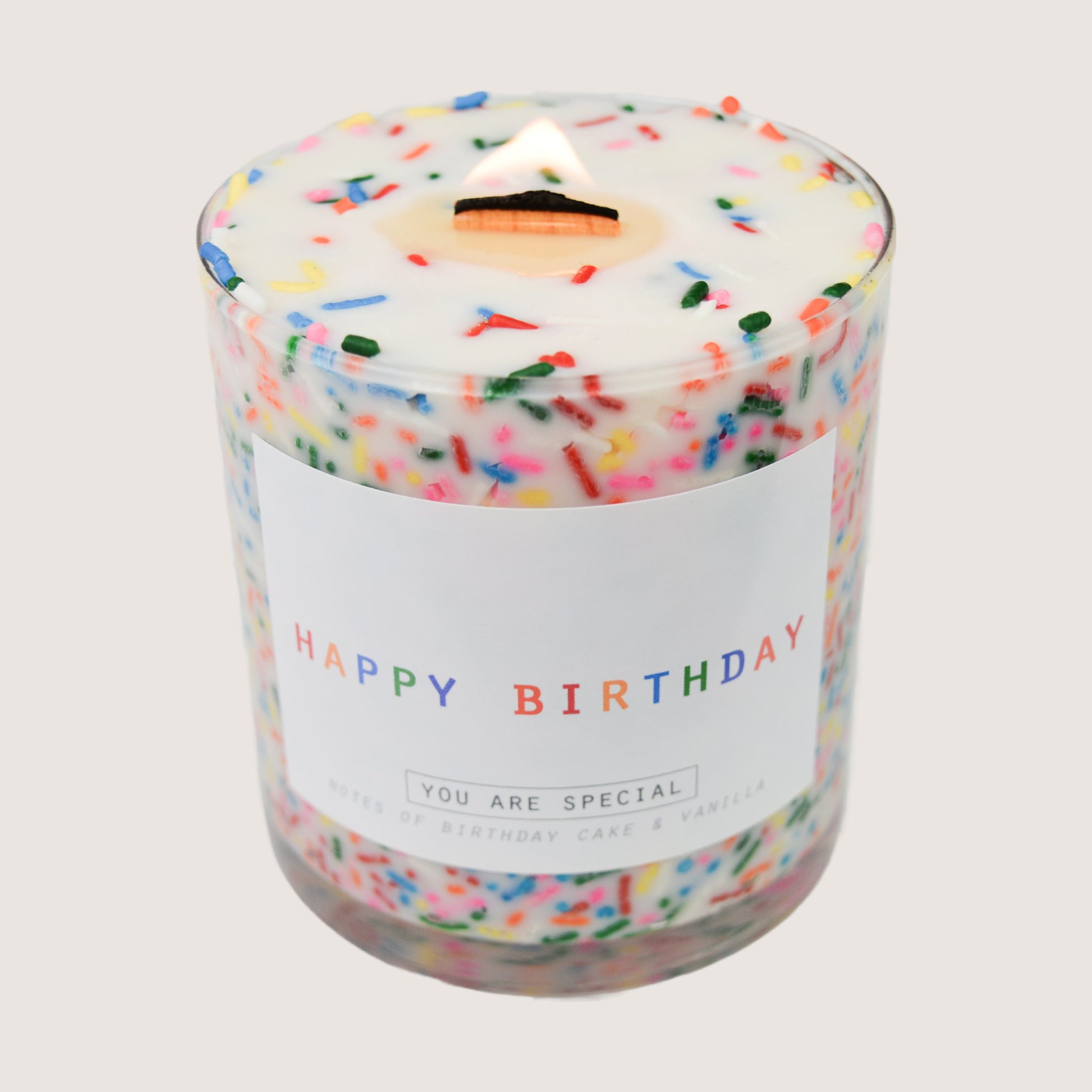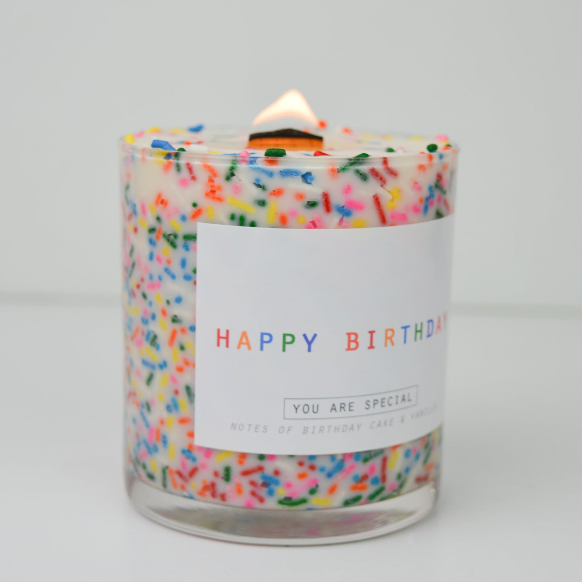 A very fitting Birthday gift. :) May this unique candle with real sprinkles inside light up your loved one's life with smiles and good smells! It smells like birthday cake with strong notes of sugar, buttercream, honey, and vanilla. The front label says HAPPY BIRTHDAY and 'you are special'. The back of this candle says 'continue good by giving a compliment to the birthday person!'
