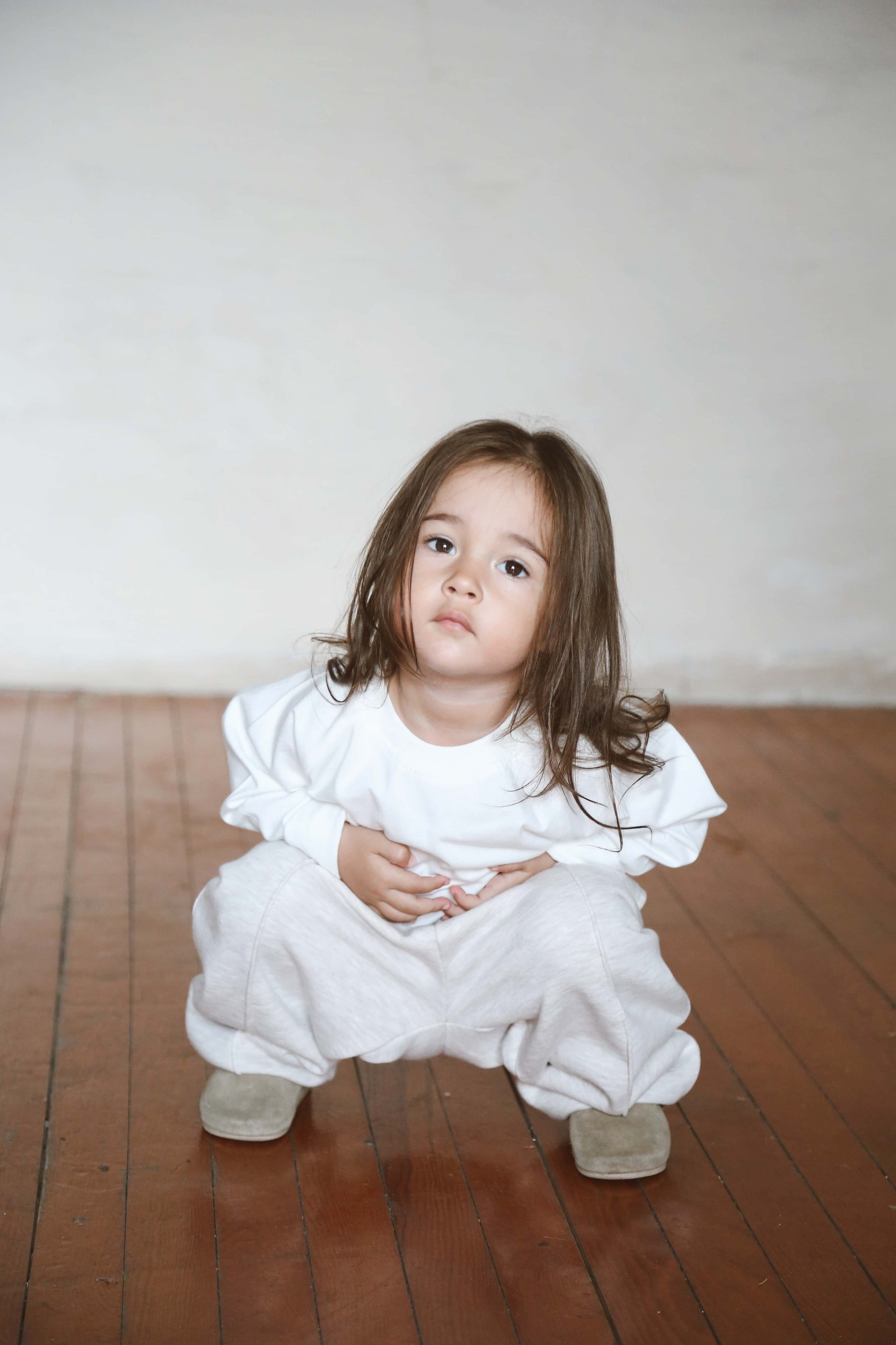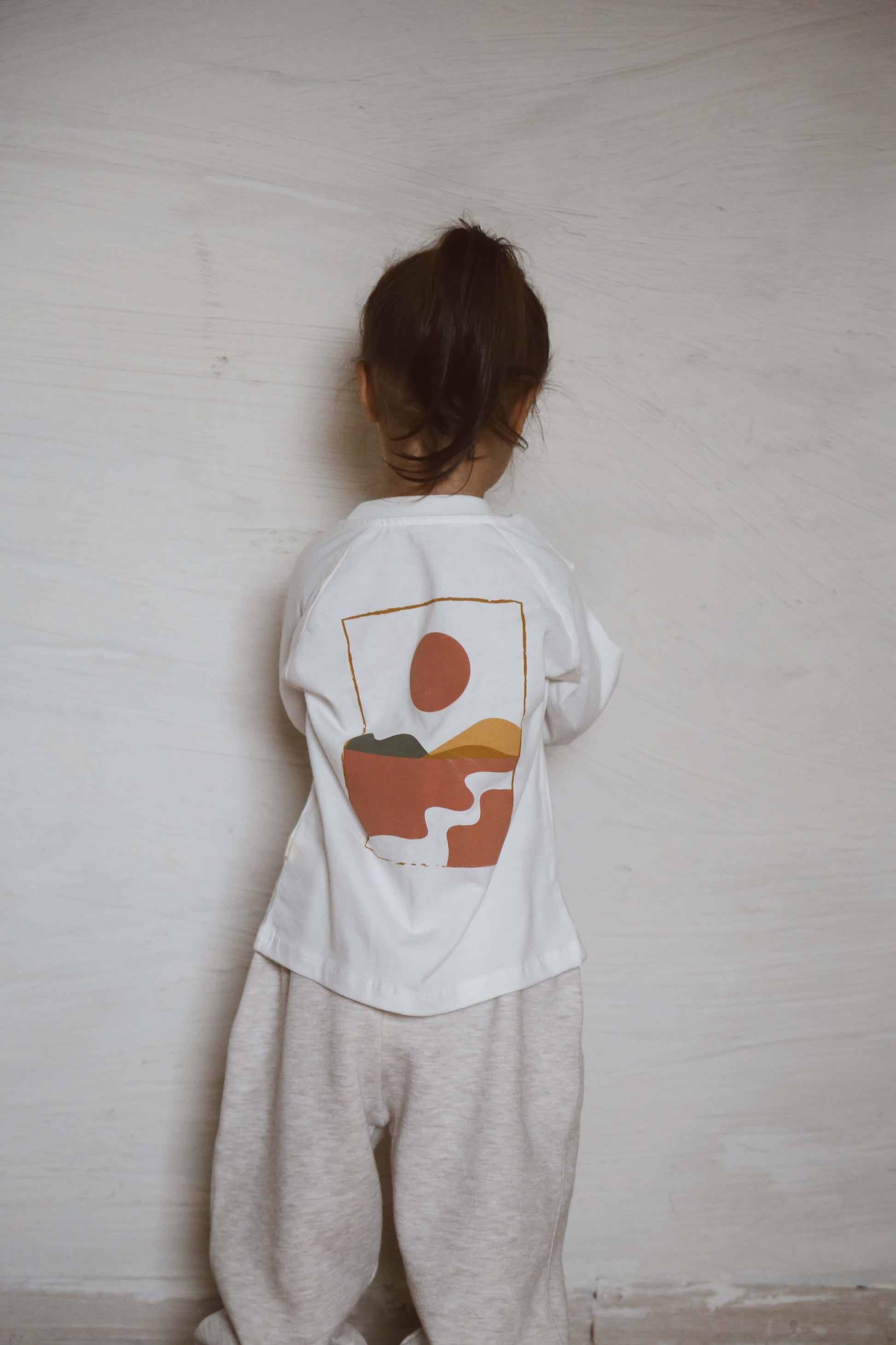 Elevate your little one's wardrobe with our Ecru Long Sleeve T-Shirt, crafted from soft and breathable cotton for all-day comfort. Featuring a bold, modern art-inspired print in playful pastel tones on the front, this tee combines artistic charm with everyday ease. Perfect for layering or wearing solo, its relaxed fit and cuffed sleeves ensure freedom of movement and effortless style. Also available in a minimalist version without the graphic for a clean, classic look.
