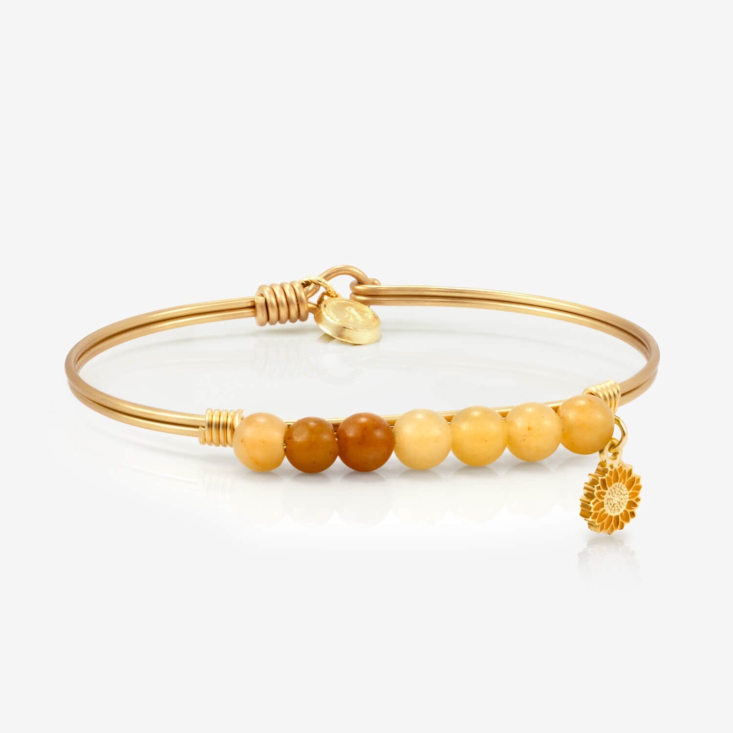 Embrace the colors of an autumn morning with the Autumn Sunrise Bangle Bracelet. Let this bangle made of genuine pineapple jasper beads with a delicate sunflower casting colored in sunshine wrap your wrist in the warmth and beauty of autumn's hues! This bracelet features 6mm Genuine Pineapple Jasper Beads and an Autumn Sunflower in Oxidized Silver /Semi Bright 12KT Gold Plated.
