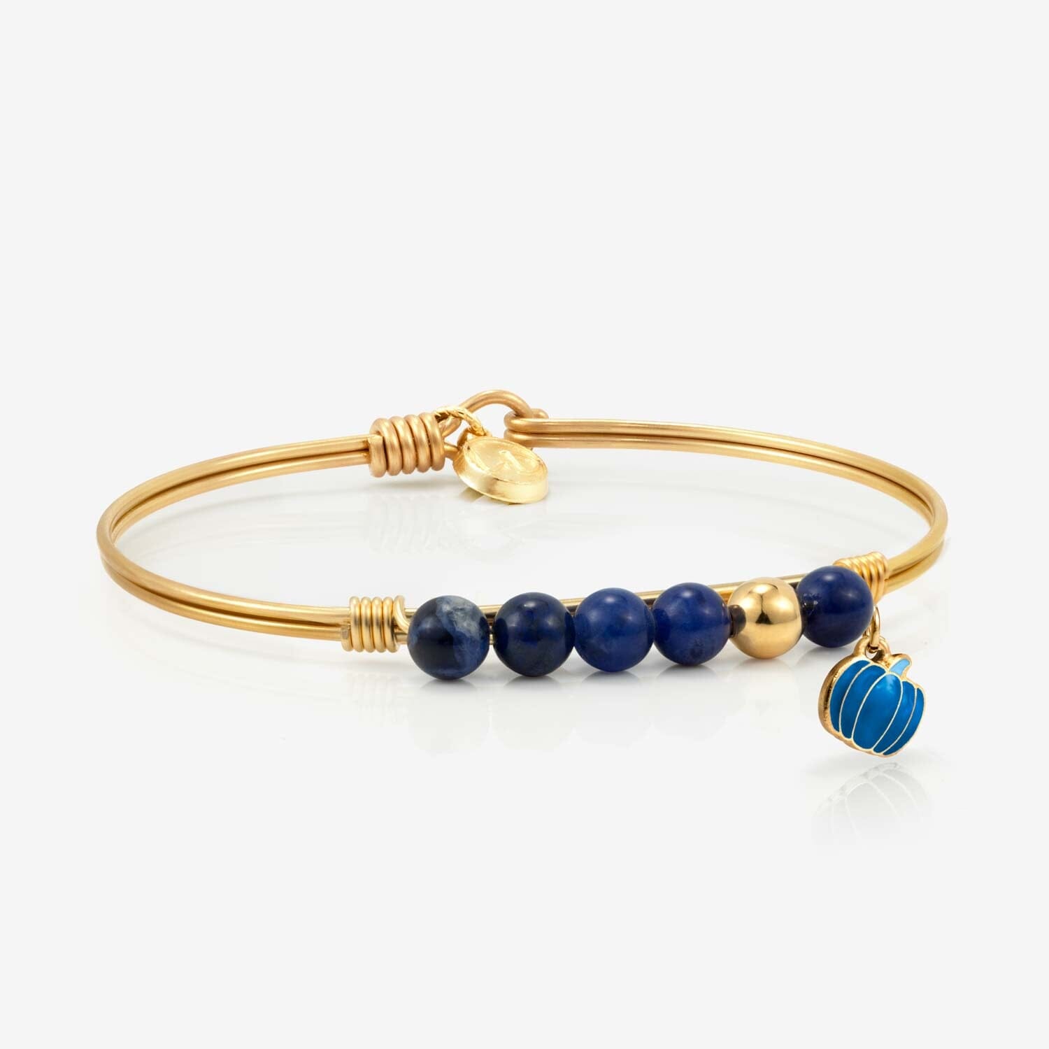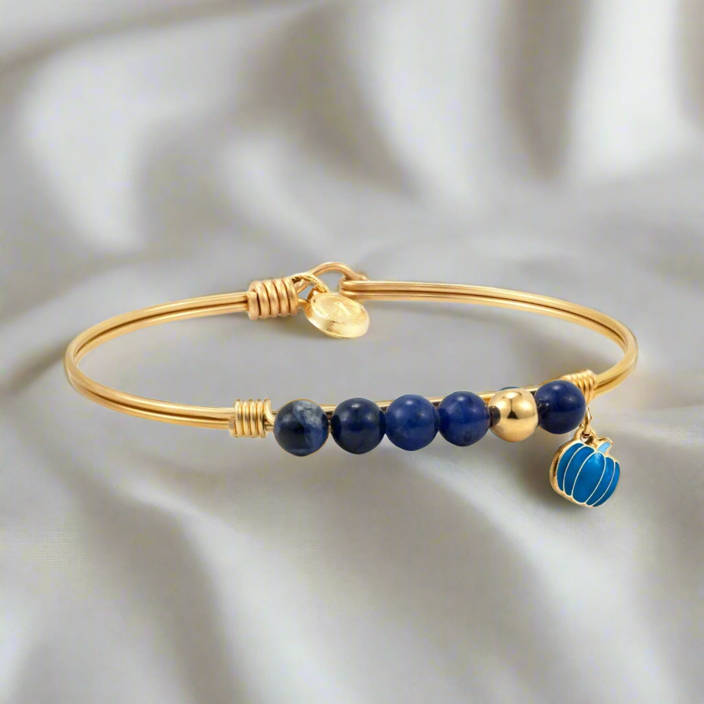 Channel the coziness of autumn with the Denim Jean Pumpkin Bangle. 6mm genuine sodalite beads, a pop of metal and our denim ombre pumpkin is the perfect mix of seasonal charm with a new modern twist that will look perfect with your all your favorite denim! This bracelet features 6mm Genuine Sodalite Beads, 6mm Oxidized Silver/Semi Bright 12KT Gold plated finish Brass Bead and a Denim Ombre Pumpkin Charm in Oxidized Silver/Semi Bright 12KT Gold plated finish.