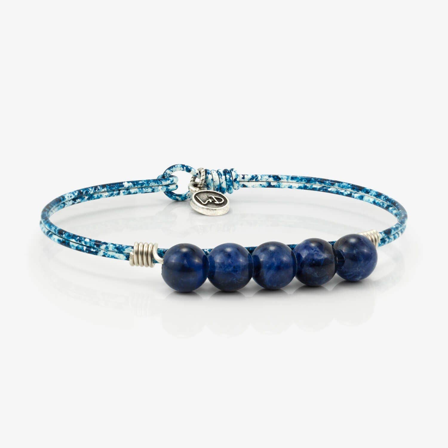 The denim-inspired splatter design pairs harmoniously with genuine sodalite beads, crafting a fun seasonal look to wear with all your fall denim! This shades of blue bracelet embodies a modern aesthetics and is sure to become an everyday classic! This bracelet features Denim splatter bangle and an 8mm Genuine Sodalite bead.