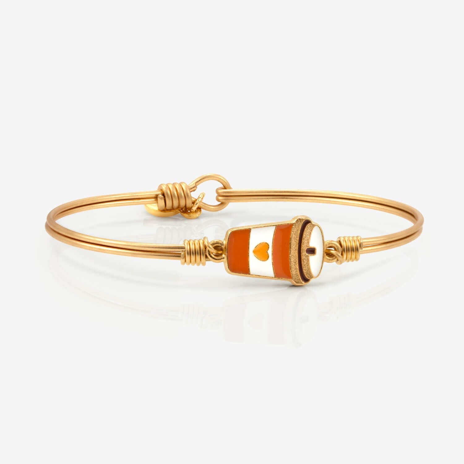 Embrace the warm and cozy vibes of autumn with the Pumpkin Spice Bangle Bracelet. Carry your Pumpkin Spice Latte wherever you go! This bracelet features Semi Bright 12KT Gold/Oxidized Silver plated finish Latte cup.