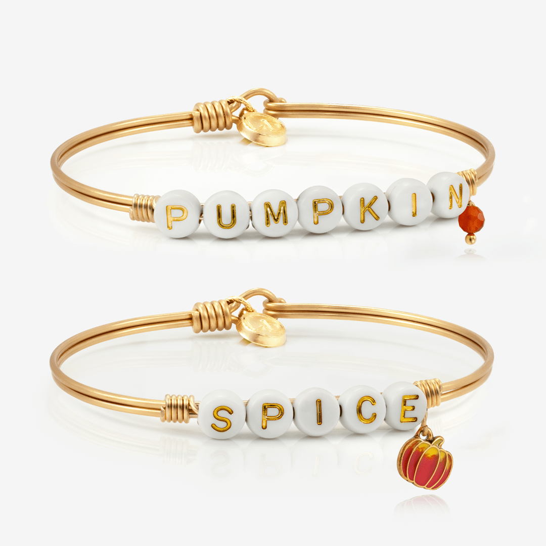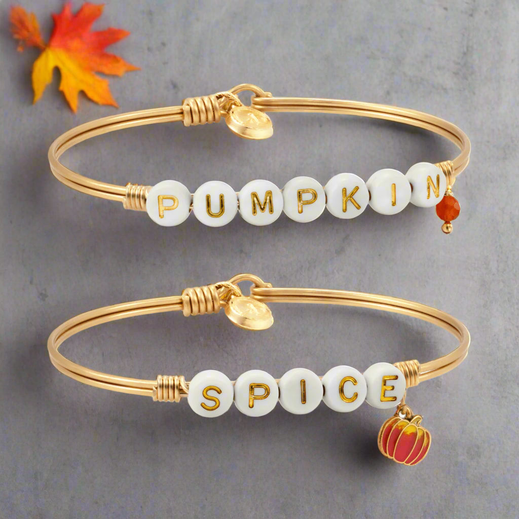 The Pumpkin Spice Bangle Sets adds a touch of whimsy to your fall outfits. Whether you're strolling through colorful foliage or enjoying pumpkin-flavored treats, this bracelet set is a stylish celebration of all things fall! Set of two bracelets with individual words. Only comes with gold letters. This bracelet features 4mm genuine faceted Carnelian bead and an Autumn Ombre Pumpkin Charm in Semi Bright 12KT Gold plated finish.