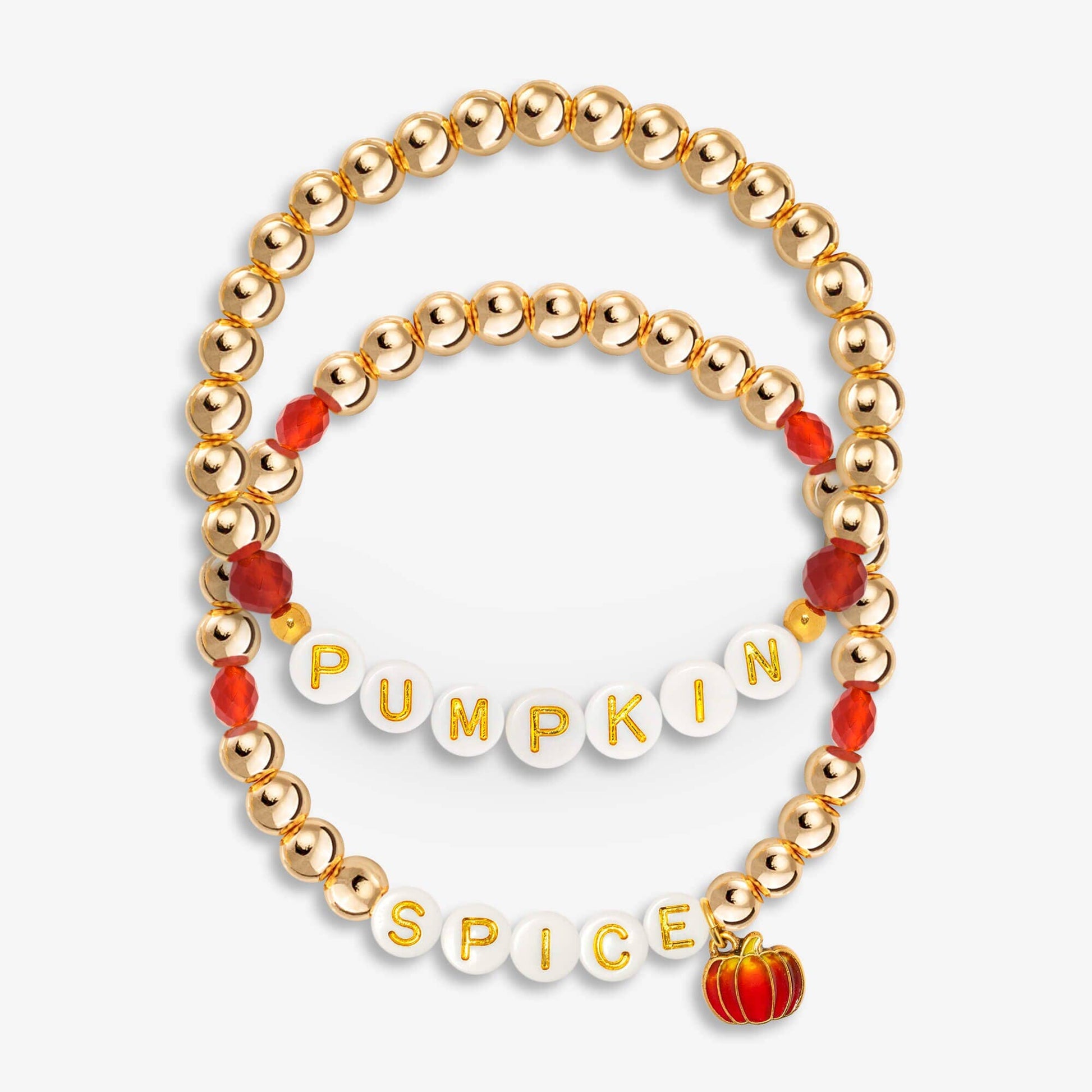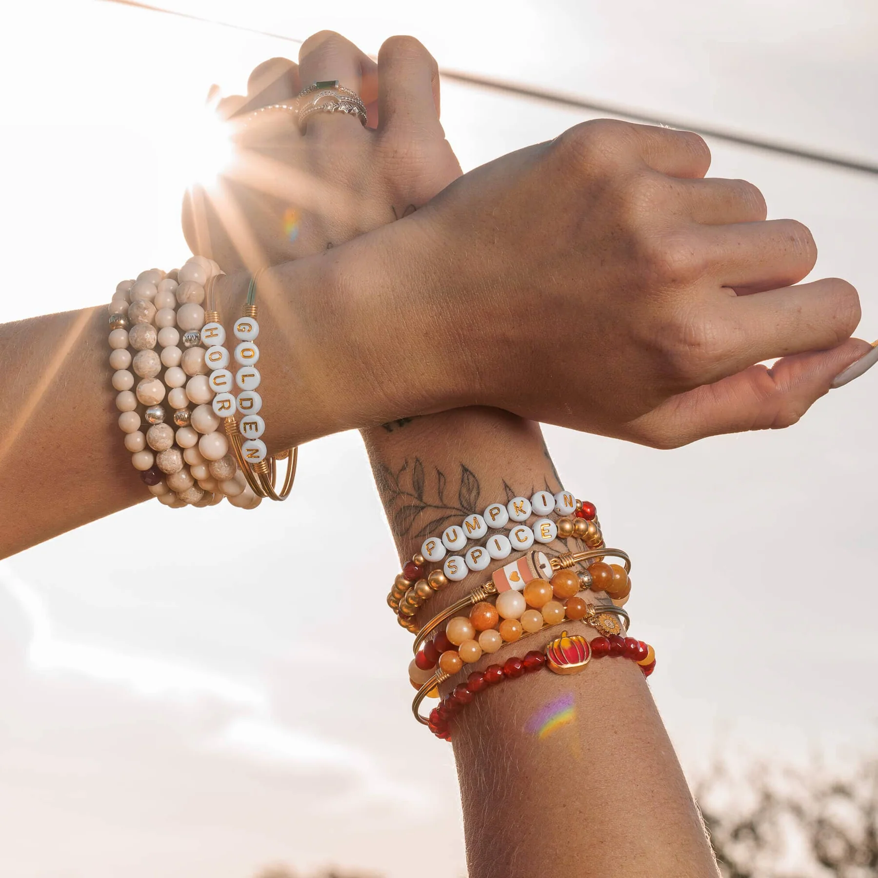 Experience the joy of autumn with the Pumpkin Spice Stretch Bracelet Set! Adorn yourself with this set to echo the warm and cozy hues of a autumn and all things pumpkin spice! Only available in gold finish. This bracelet features 4mm Faceted Genuine Carnelian Beads, 6mm Semi Bright 12KT Gold Plated finish Brass Beads and an Autumn Ombre Pumpkin charm in Semi Bright 12KT Gold Plated finish.