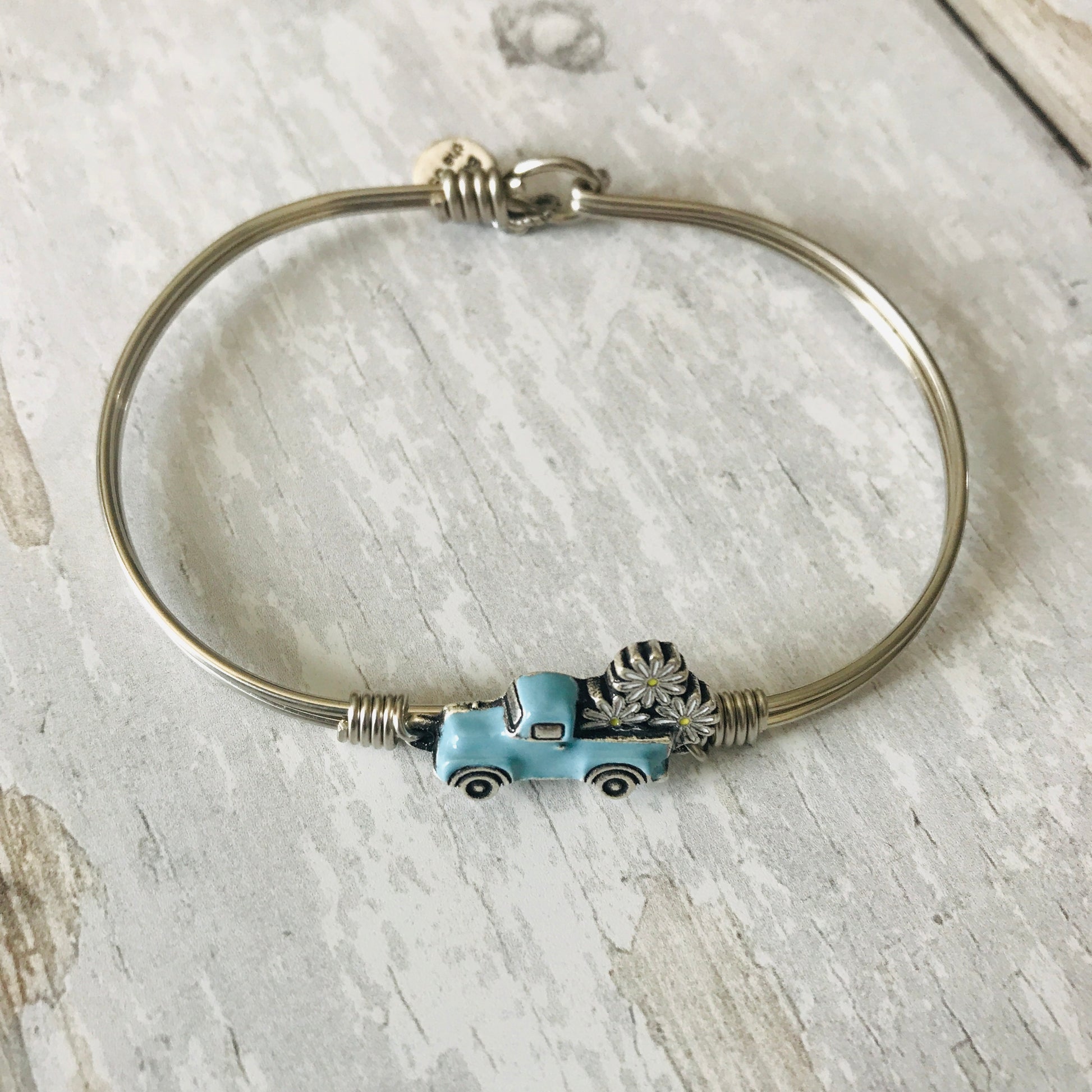 This season, pick-up a little nostalgia with a detail-driven throwback. This handmade Vintage Spring Truck Bangle shifts gears toward a more laidback pace of life, with its bed full of white daisy flowers playing off of the light blue enamel-painted design.