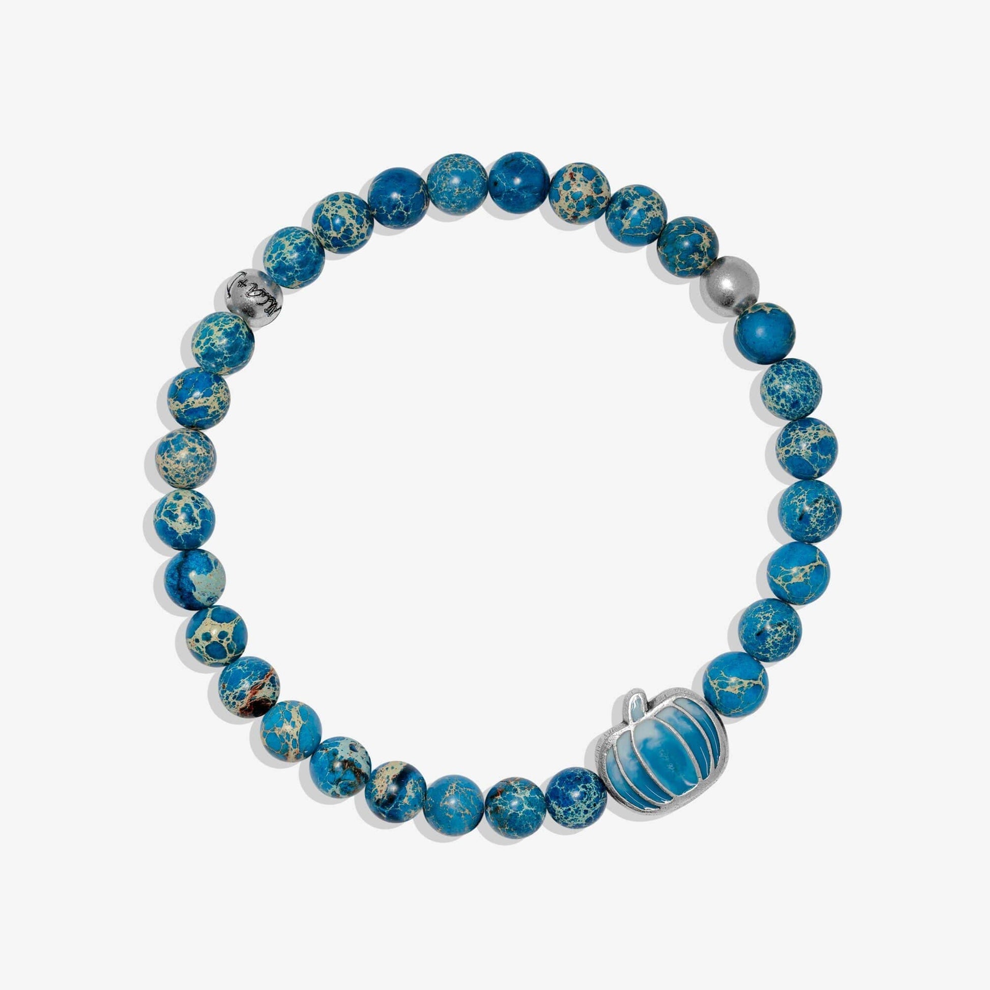 The Denim Ombre Pumpkin Stretch has all the shades of your favorite blue jeans! The genuine blue magnesite beads combined with the faded denim pumpkin bead is the perfect mix of everything we love about Fall! Grab your jean jacket, it is pumpkin picking time! This bracelet features 6mm Genuine Blue Magnesite beads, 6mm oxidized silver plated finish brass bead and a Denim Ombre Pumpkin Bead in Silver Ox plated finish.