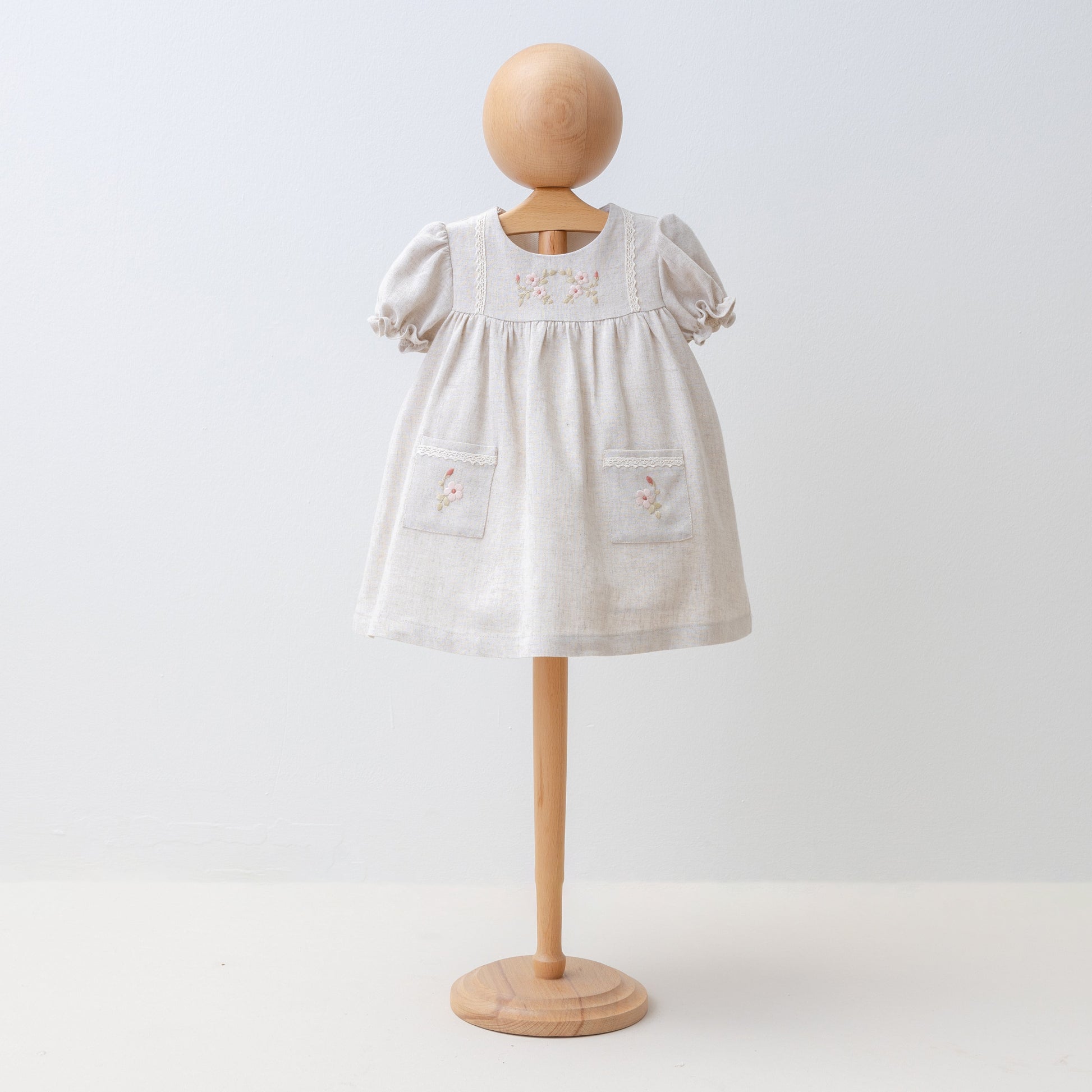 The Meadow Dress is a timeless piece with soft puff sleeves, delicate floral embroidery, and dainty lace details that bring a vintage charm to every moment. Made from a breathable linen-blend fabric, it’s perfect for warm days and special outings, with little front pockets that add both sweetness and practicality. Ethically made in Turkey, this dress is as comfortable as it is beautiful—an instant favorite for little wardrobes.