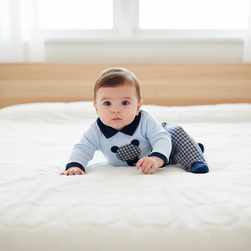 Timeless charm meets everyday comfort in our Navy Check Bear Romper. Designed with a soft blue upper and navy checkered lower half, this romper features a sweet teddy bear appliqué, decorative front pockets, and a smart collar detail.