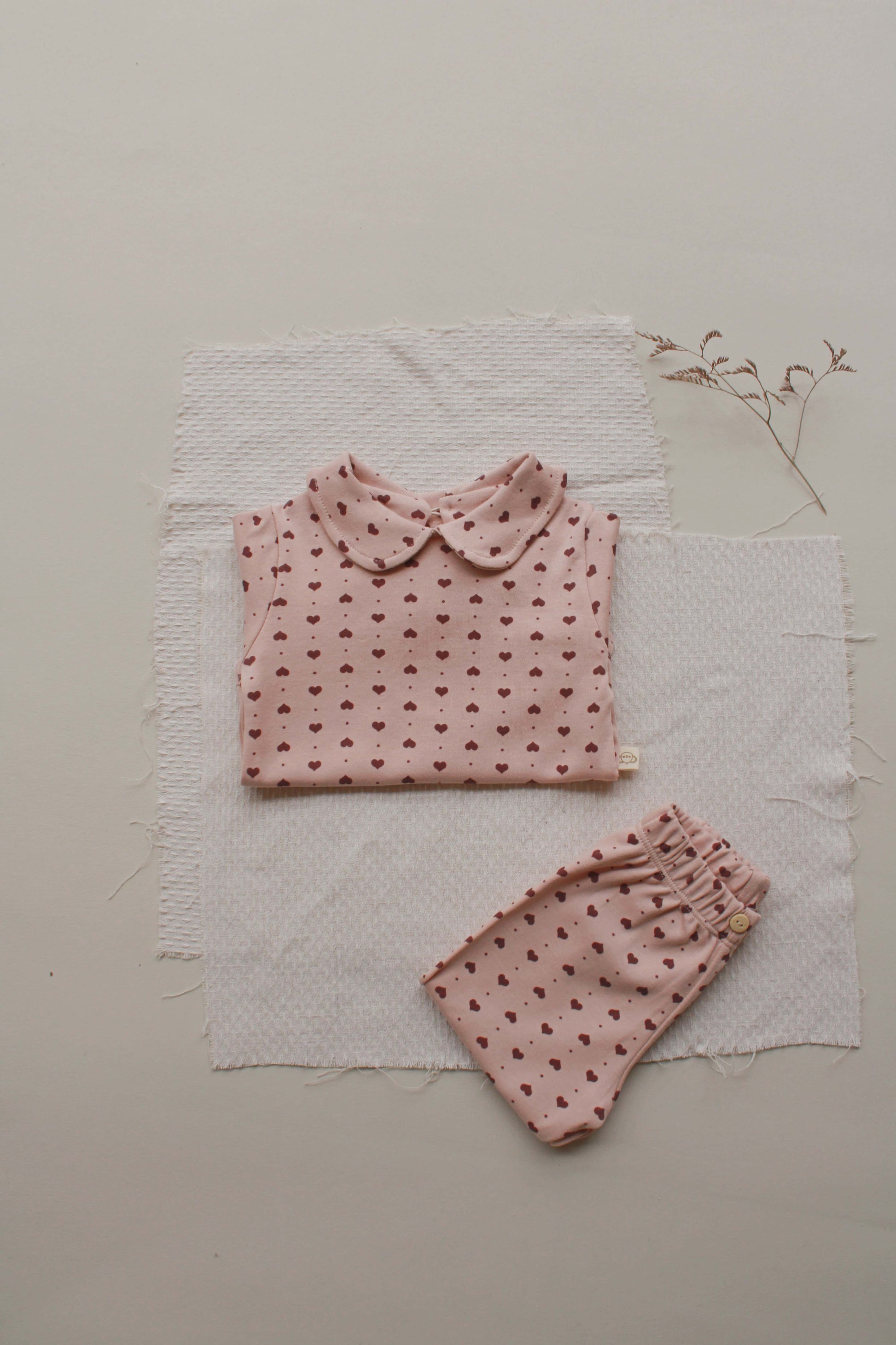 Sweet and timeless, our Pink Heart Collar Two-Piece Set is designed for both comfort and charm. The long-sleeve bodysuit features a darling Peter Pan collar and snap closures for easy changes, while the matching pants with a soft elastic waist keep little ones cozy all day. Made from breathable cotton, this set is perfect for playdates, photos, or gifting.