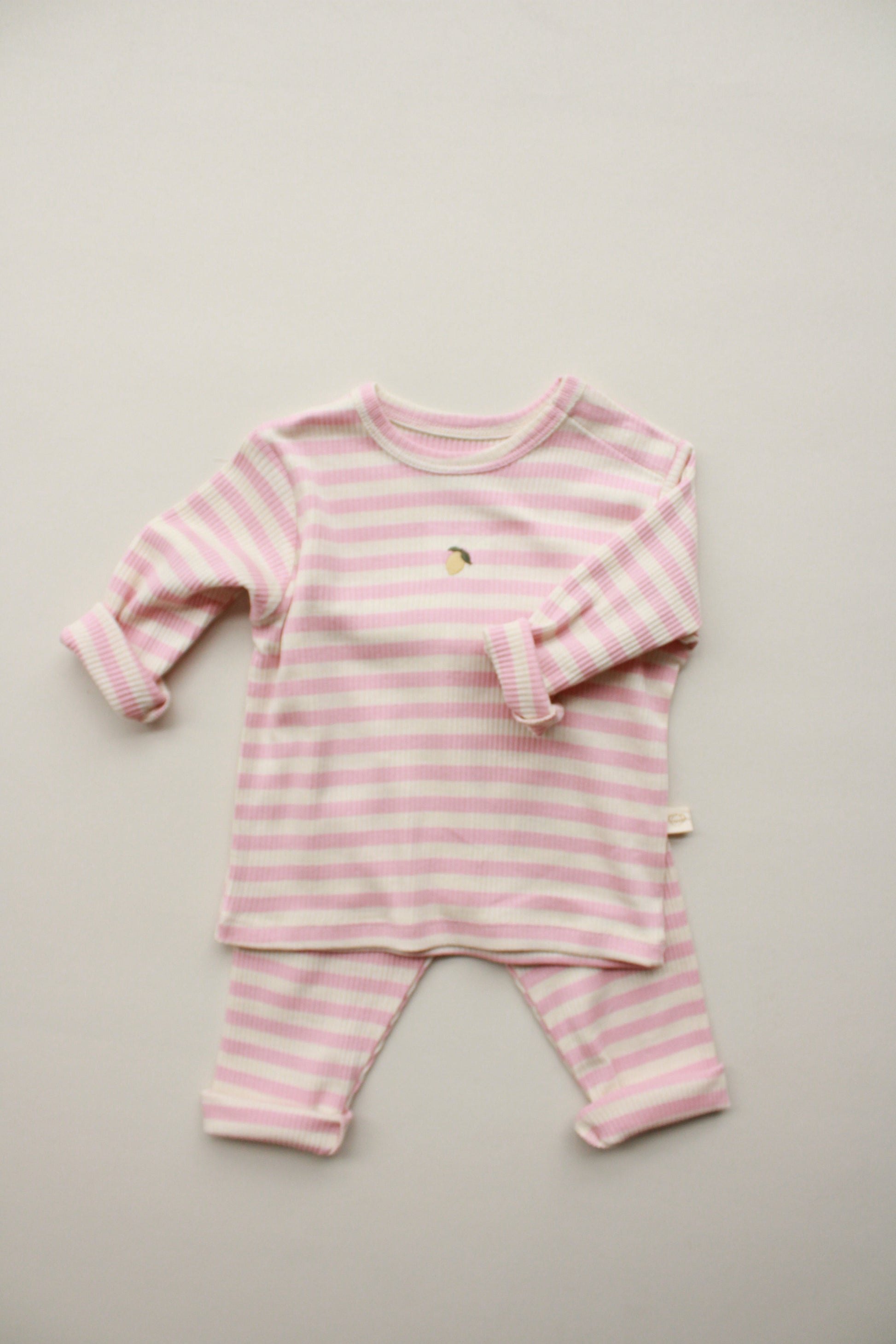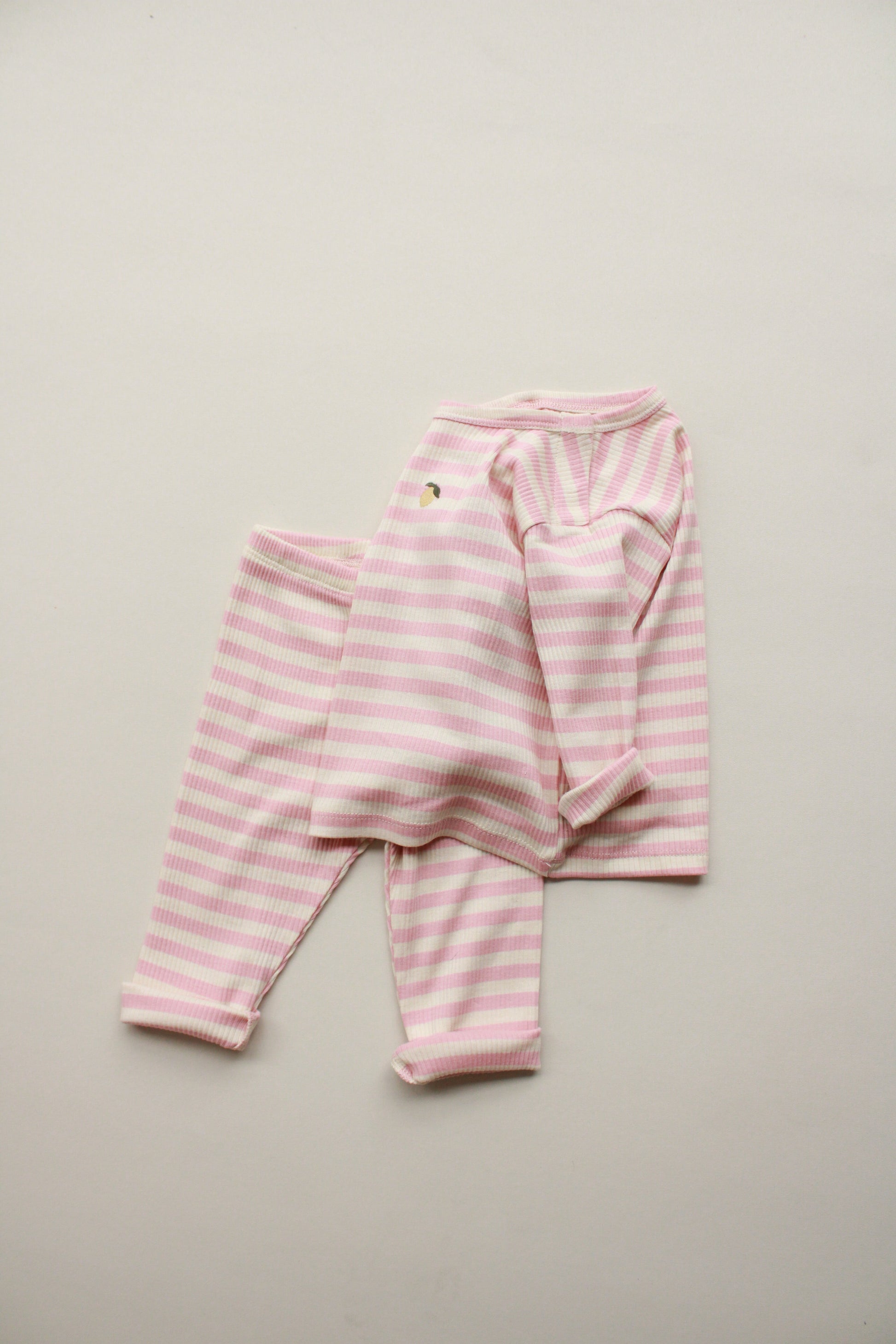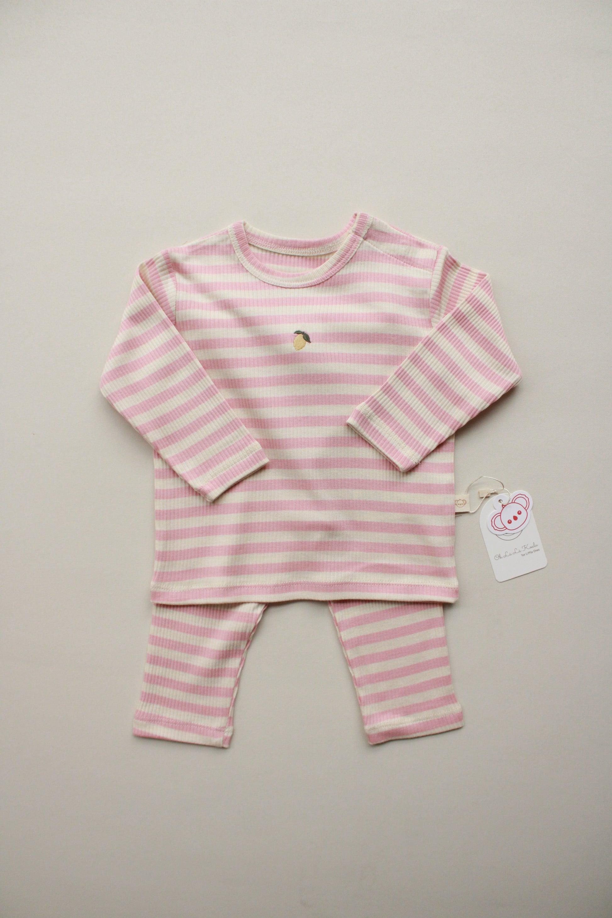 The Pink Lemon Two-Piece Set brings playful sweetness and everyday comfort together. Crafted from soft, breathable cotton, it features a cozy long-sleeve top and matching striped pants with a cute lemon embroidery. The stretchy ribbed fabric ensures gentle wear for delicate baby skin, while the pastel pink and cream tones make it perfect for any season. Ethically made in Turkey.