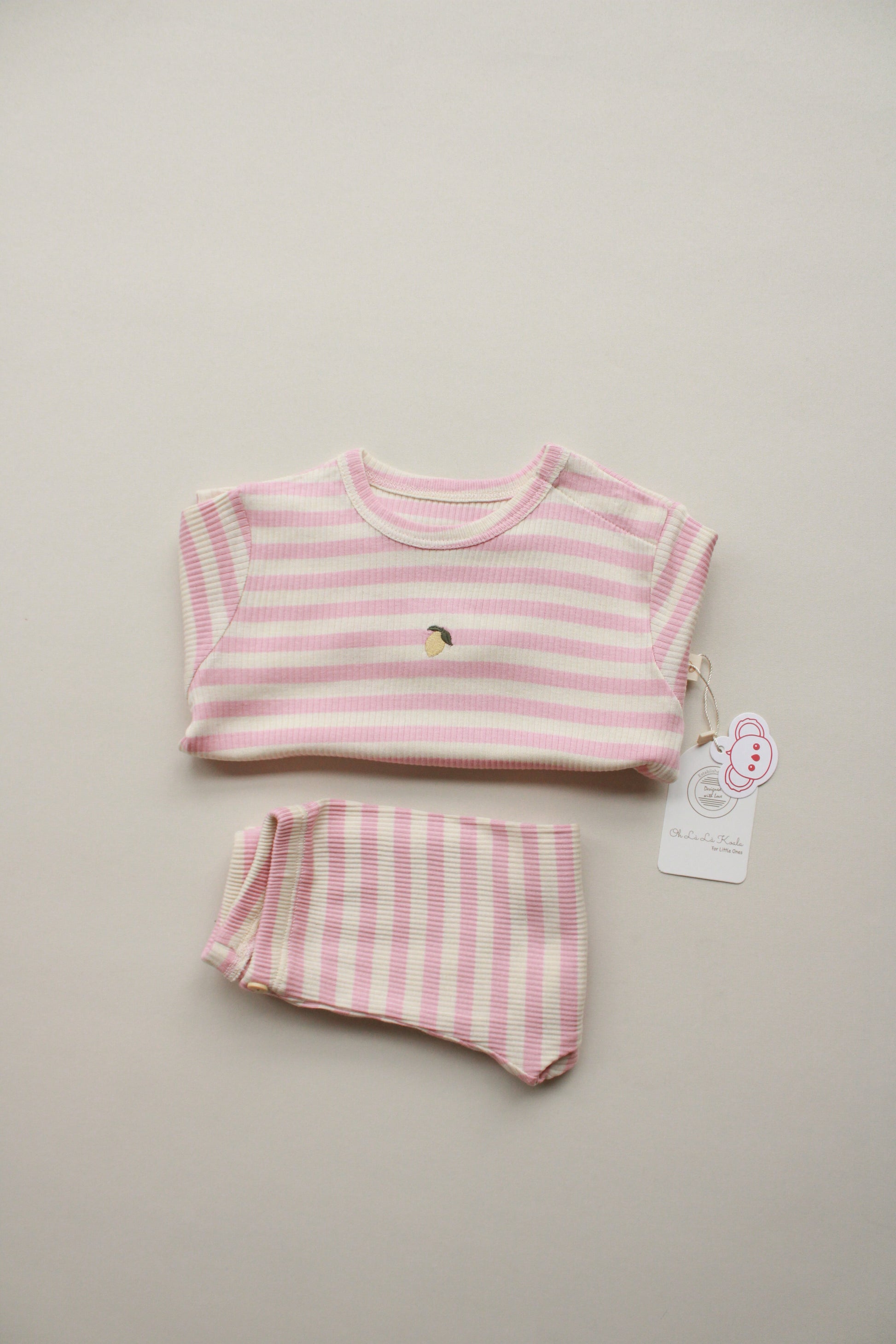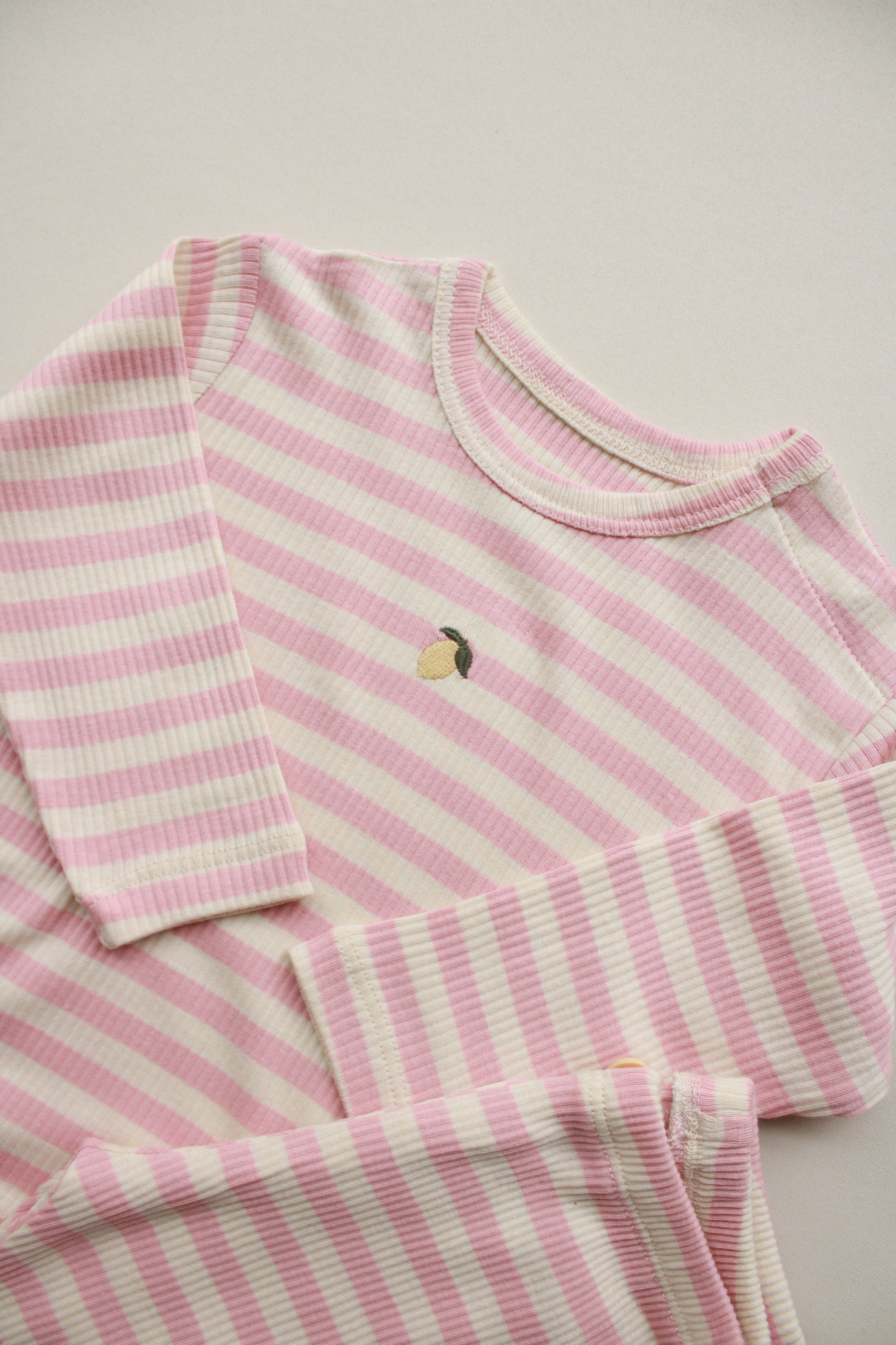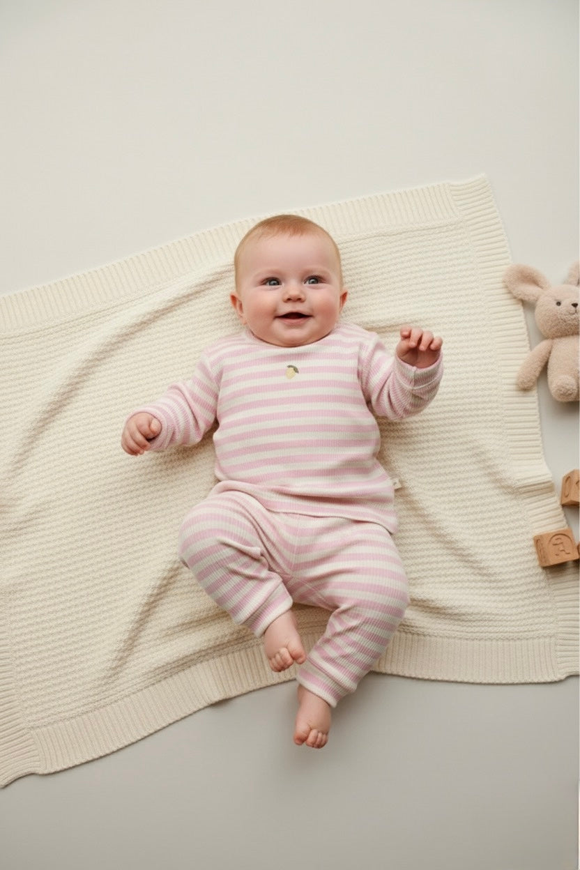 The Pink Lemon Two-Piece Set brings playful sweetness and everyday comfort together. Crafted from soft, breathable cotton, it features a cozy long-sleeve top and matching striped pants with a cute lemon embroidery. The stretchy ribbed fabric ensures gentle wear for delicate baby skin, while the pastel pink and cream tones make it perfect for any season. Ethically made in Turkey.