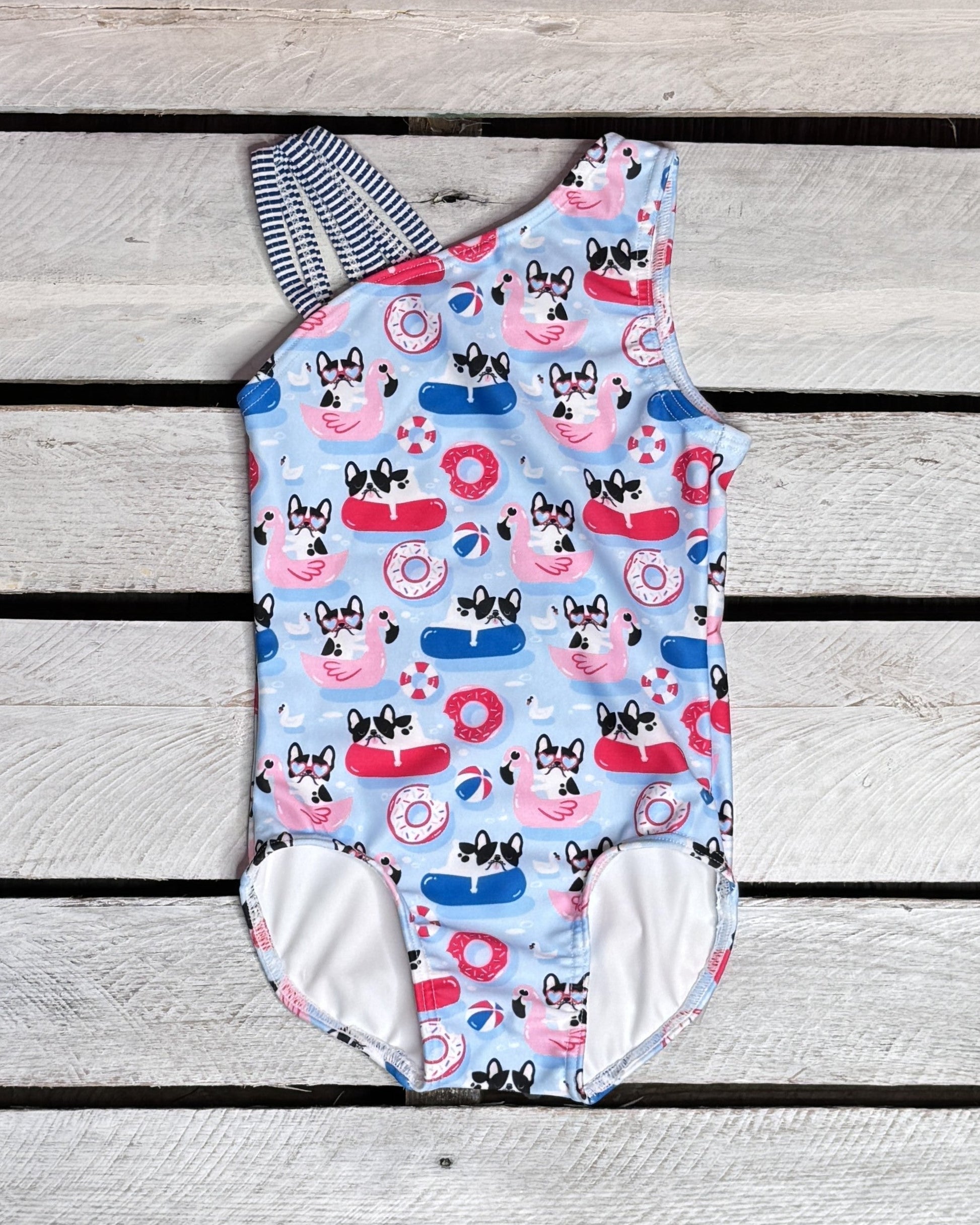 Make a splash this summer with your favorite dog by your side in our Pool Pups Collection. This girl one piece comes in our Pool Pups print and a strappy shoulder moment! As always our suits are made with UPF 50+ fabric and made in the USA!