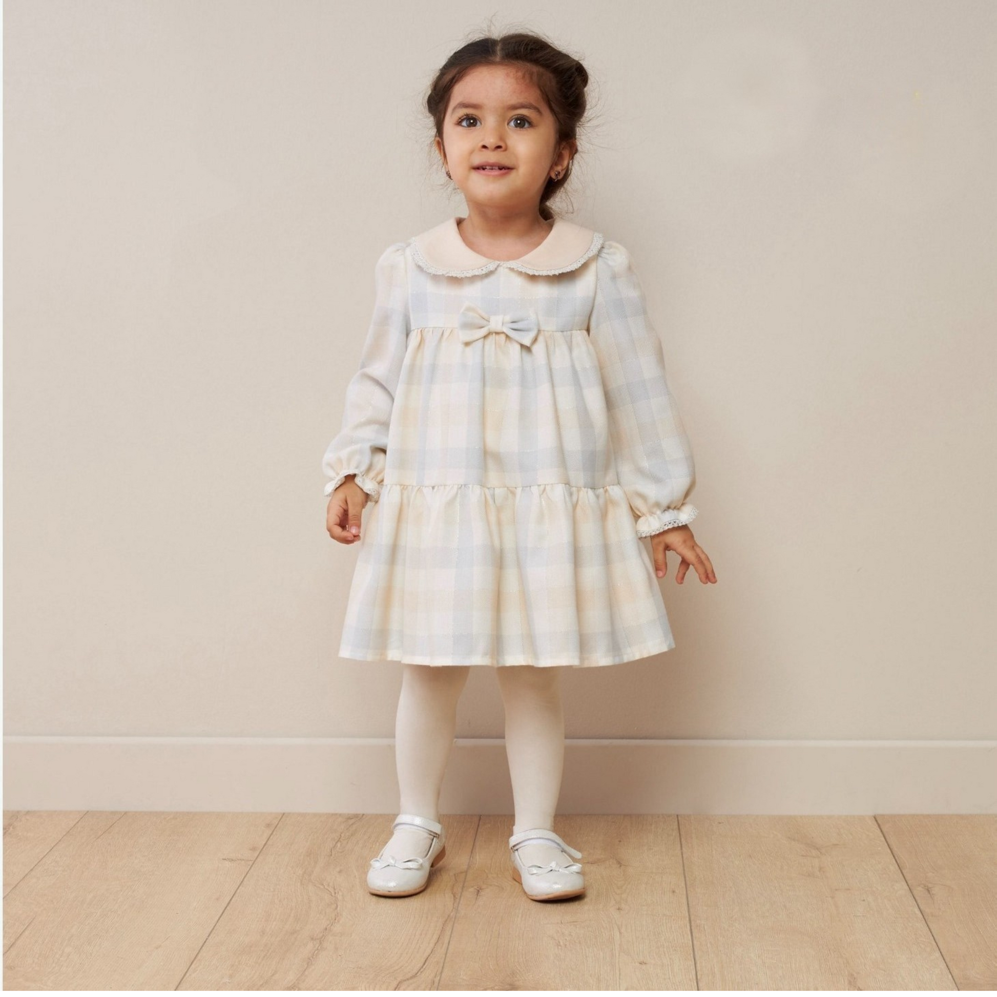 Sweetness in every stitch. The Powder Plaid Bow Baby Dress is a soft, pastel dream featuring a gentle blue and beige check pattern, long sleeves with ruffle cuffs, and a tiered skirt for extra volume and twirl. A delicate lace-trimmed Peter Pan collar and an adorable front bow add the perfect finishing touch. Ideal for fall outings, family photos, or special celebrations.