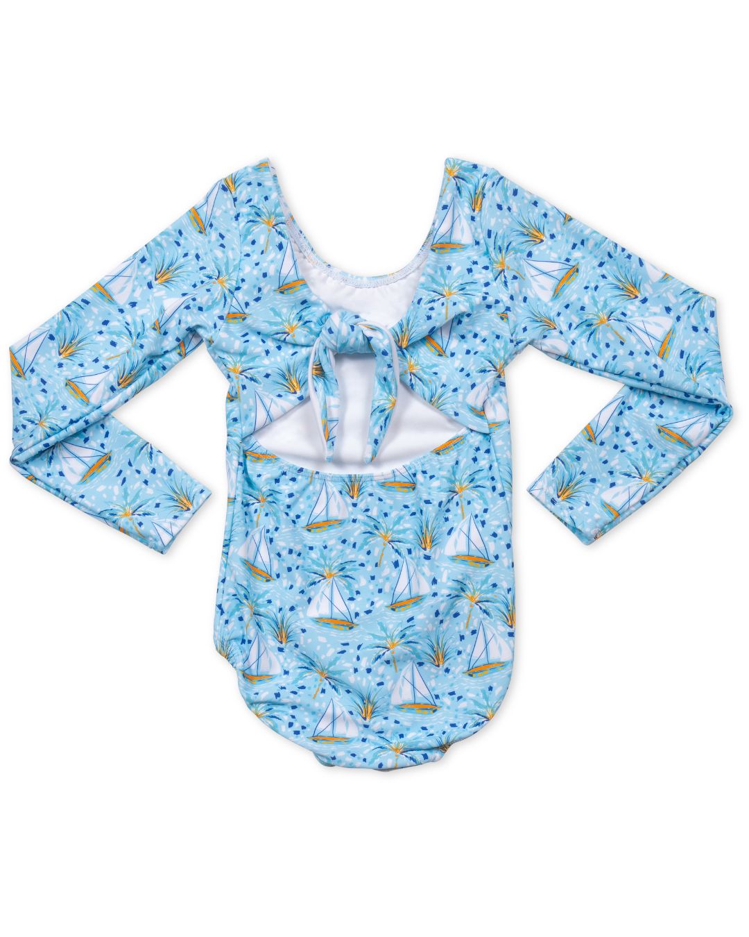 Set sail for adventures of a lifetime with our Sail Boats Paradise Collection! This stunning array of nautical-inspired items captures the essence of the open sea and the thrill of exploration. This adorable one piece suit is lined front and back and includes an adorable tie knot in the back. As always, all of our swimwear is made of UPF 50+ fabric and proudly made in the USA!