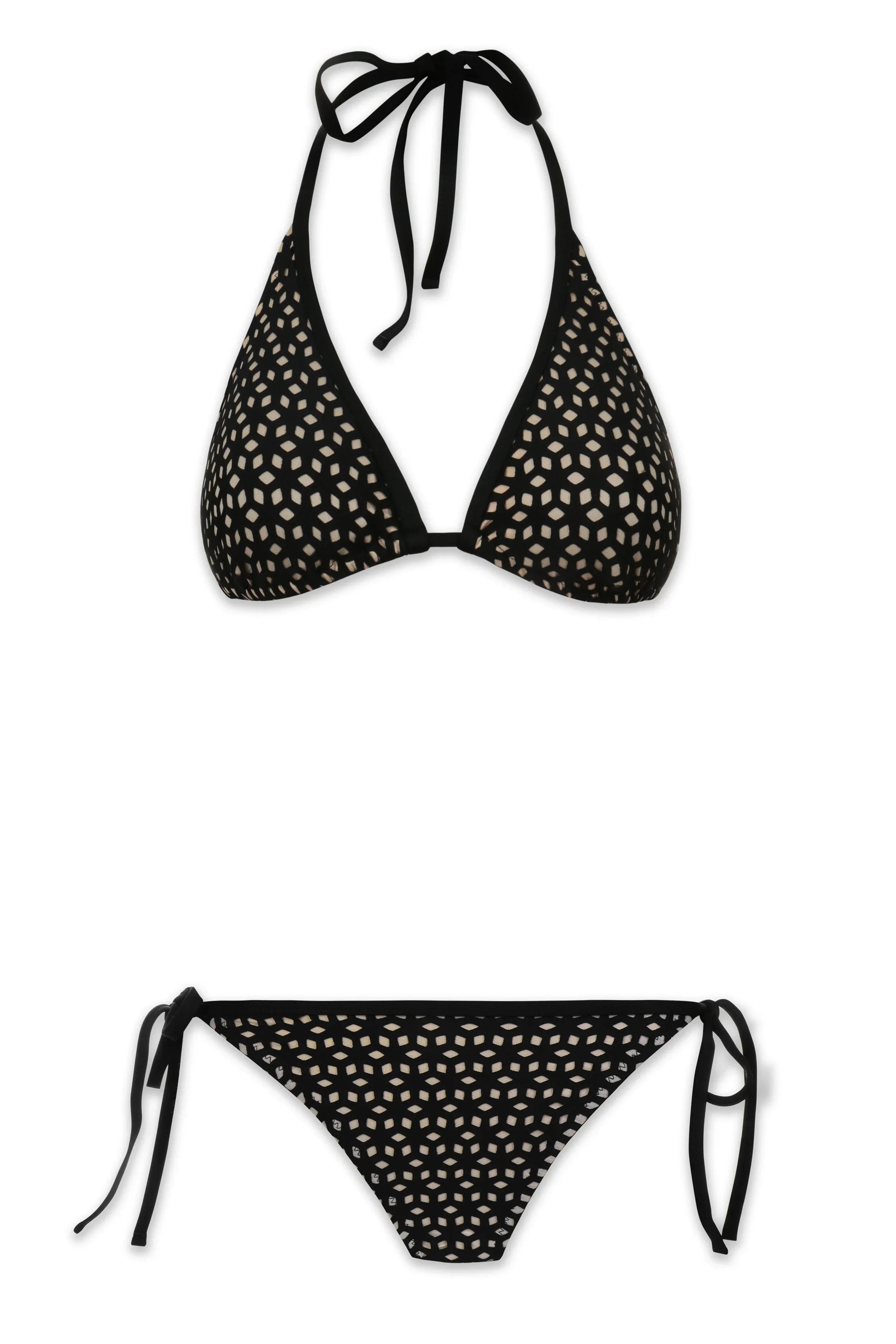Precision meets artistry in our Black Laser Cut fabric. Geometric diamond patterns are meticulously cut into rich black material, creating a modern lace effect that reveals a sophisticated sand-colored lining beneath. This technical fabric combines contemporary design with traditional elegance, offering visual interest through negative space and contrast.
