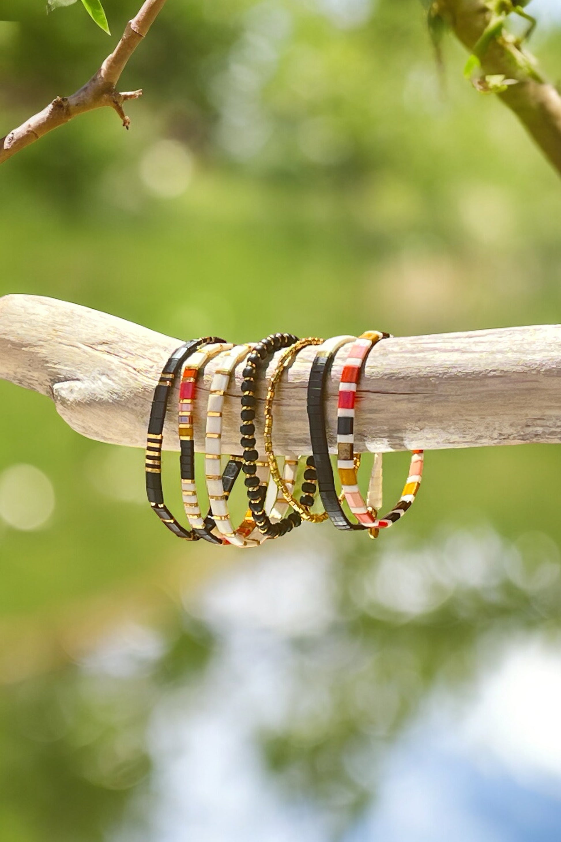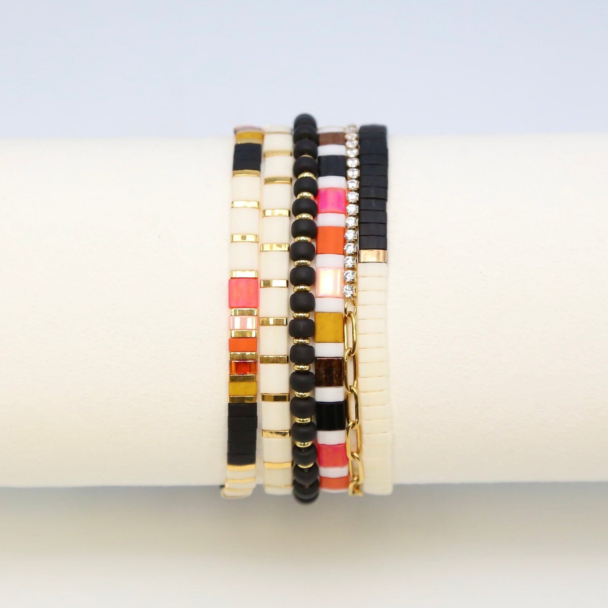 Our SUNDANCE bracelet stack includes SIX total bracelets! (Yes, 6!!) Included in the stack are 4 tila bracelets with romantic colors of black, cream, gold, pink, mustard, peach and burnt orange. The fifth bracelet is a matte black with gold accents, and the final bracelet is a no-tarnish gold paperclip chain with cubic zirconia diamonds that meet half way through the bracelet.