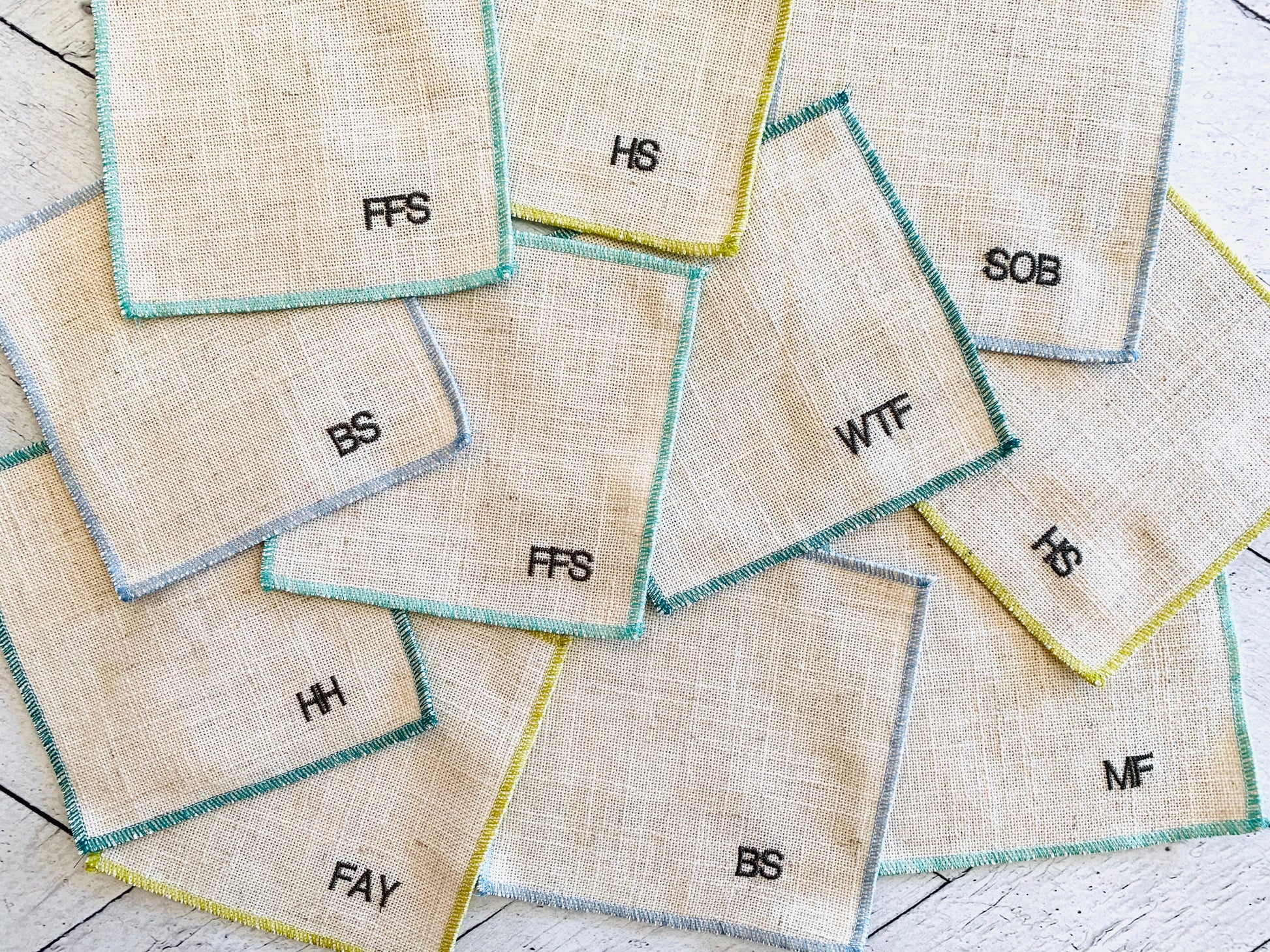 Introducing our Sweary Cocktail Coasters, a set of 8 beautifully crafted coasters that are sure to add a touch of humor to your bar cart. Each coaster features a letter that stands for a swear word, making them a fun and unique addition to any cocktail party. Handmade with love, these coasters are made from high-quality linen and poly blend materials, ensuring durability and longevity. The coasters are 5 inches square, making them the perfect size for your drinks. To care for your coasters, simply machine wash and lay flat to dry. Get ready to serve up some laughs with these coasters!