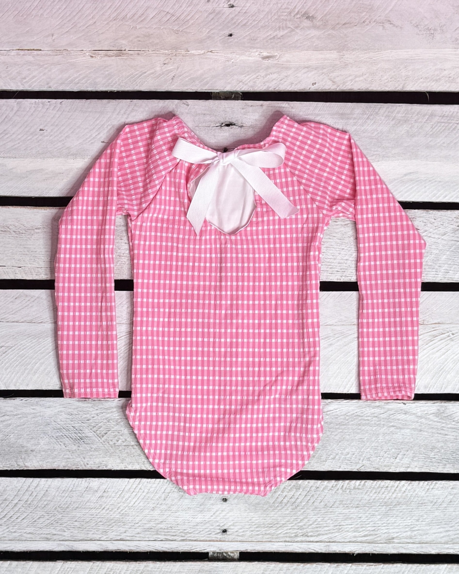 Bring timeless charm to beach days with our cute toddler and children's swimwear! This Girl's One Piece Long Sleeve Ribbon Back Swimsuit features our Pink Textured Gingham Fabric paired with a white ribbon to top it off! All of our swimwear is made in the USA! Looking for matching sibling's swimsuits? Looking to match siblings? Click HERE to shop the whole collection!