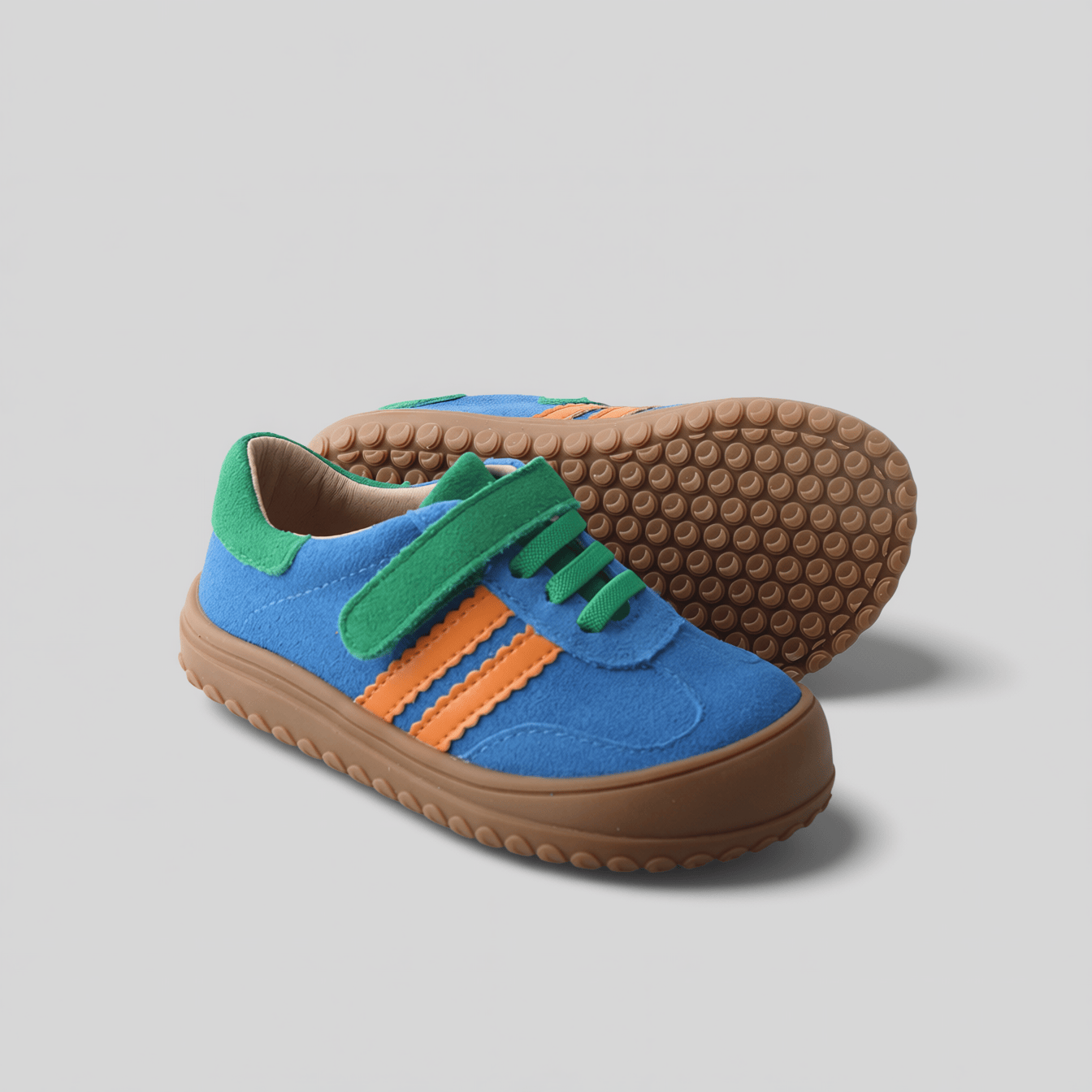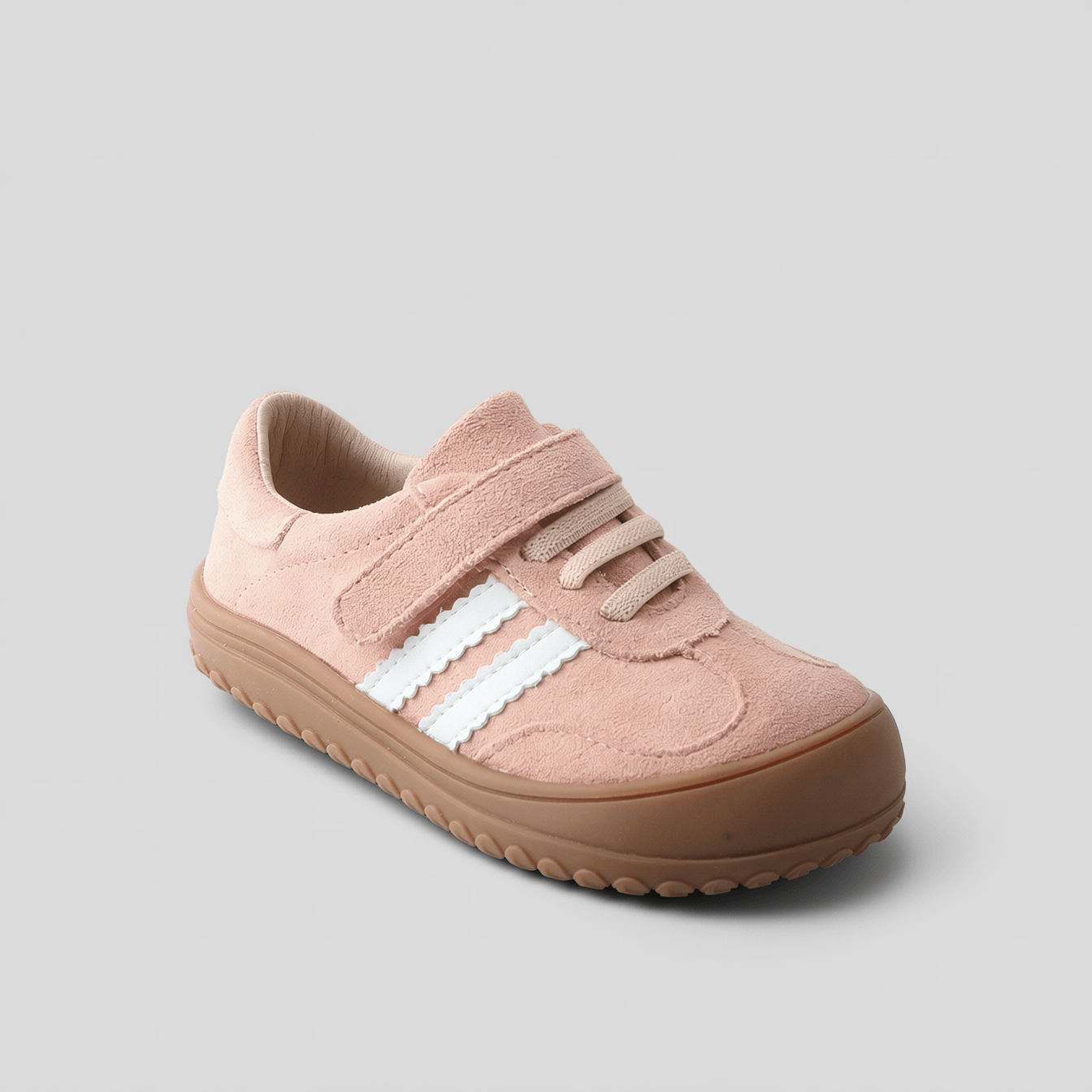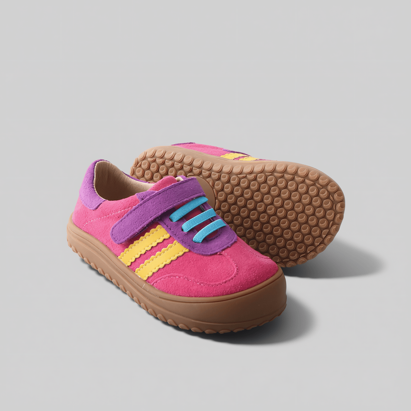 The Asha Sneaker is designed to keep up with every adventure while supporting natural foot development. Featuring a durable rubber-capped toe, wide toe-box, and our signature barefoot sole, this sneaker gives little feet the room and flexibility they need to move with confidence. The Velcro closure and elastic laces create an easy, adjustable fit, while the wide opening makes on-and-off a breeze for kids and parents alike. Finished with a sporty athletic stripe, the Asha Sneaker blends comfort, function, and style; perfect for everyday play, school days, and every moment in between.
