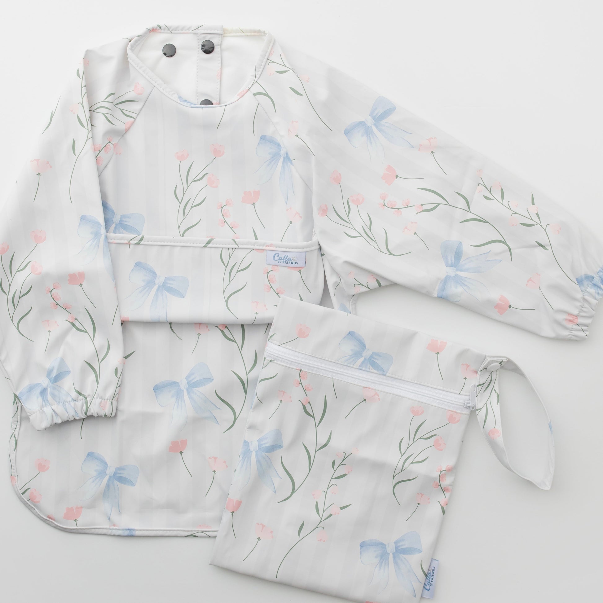 Perfect for your little one's meal-time, water table adventures, messy crafts, or any other time you want to keep those cute clothes clean. Not only do these long sleeve bibs match all of their cute clothes, they’re also highly functional. Each bib comes in a matching wet/dry bag making it perfect for on the go. Simply place your dirty bib back in its bag & keep your diaper bag clean. With their waterproof design and catch-all pocket, they effortlessly keep your baby's clothes clean and dry. The pocket even folds under to fold flat when not needed for crafts or sensory tables. The multi-snap neck closure & elastic cuffs ensure a secure and adjustable fit that grows with your little one, making them perfect for every stage of their development.