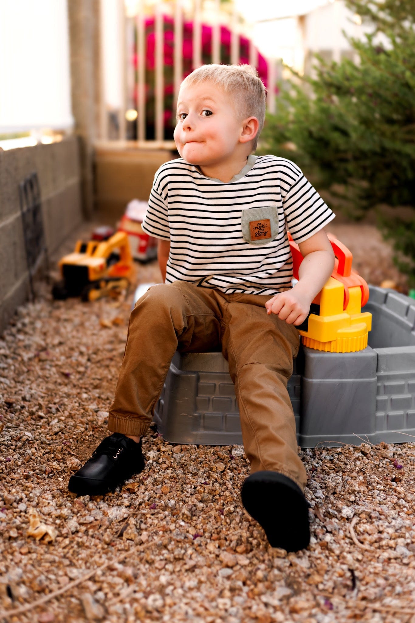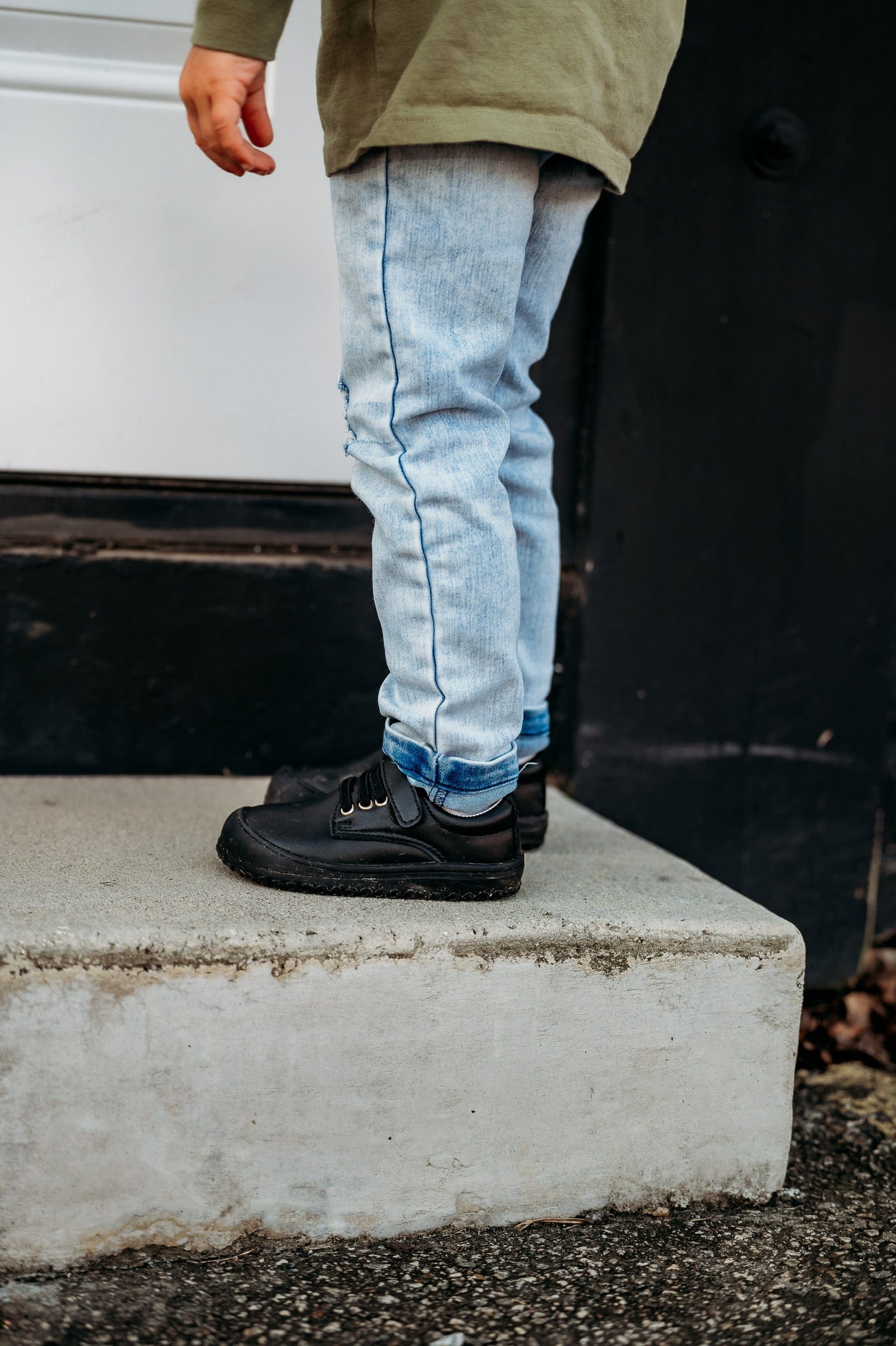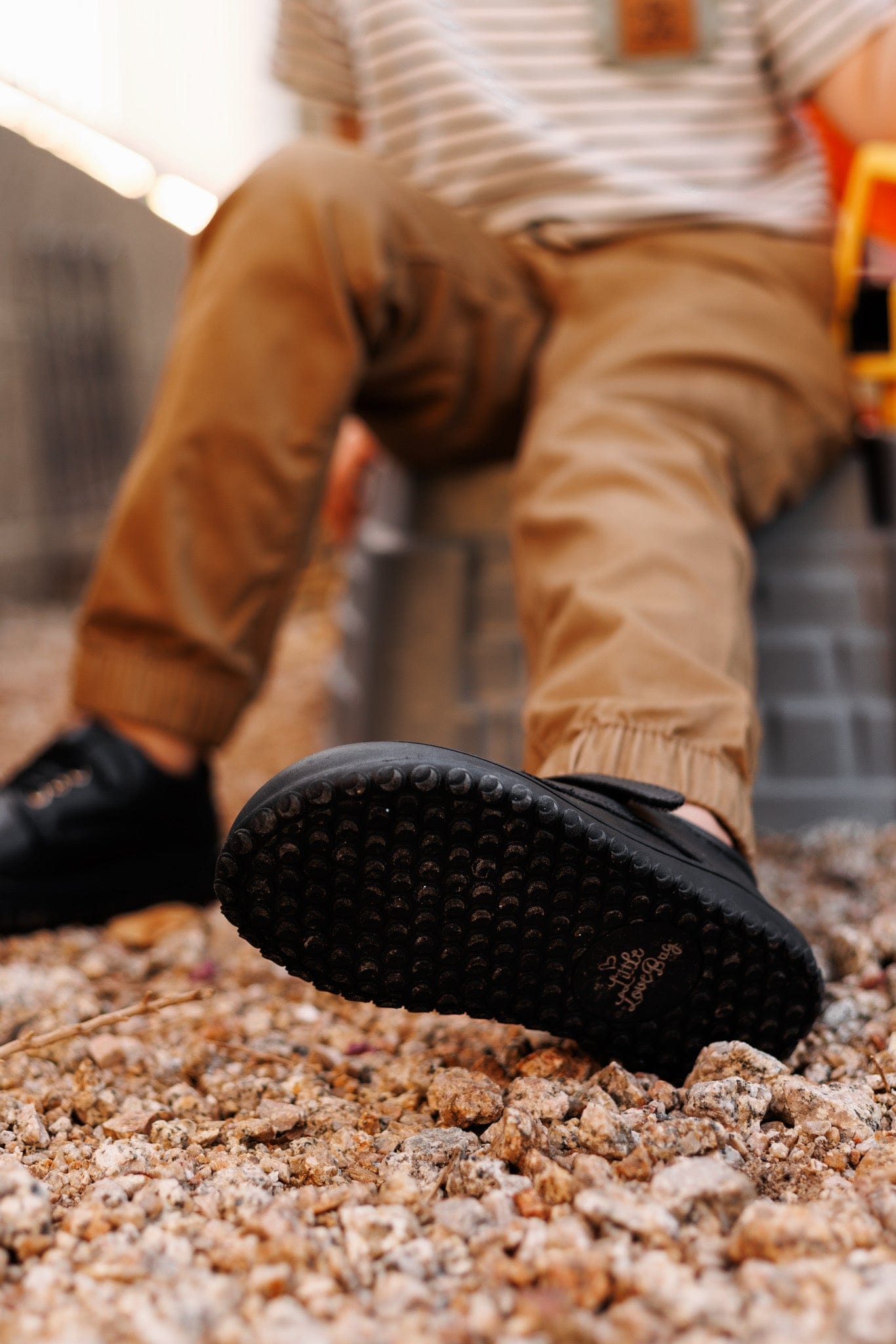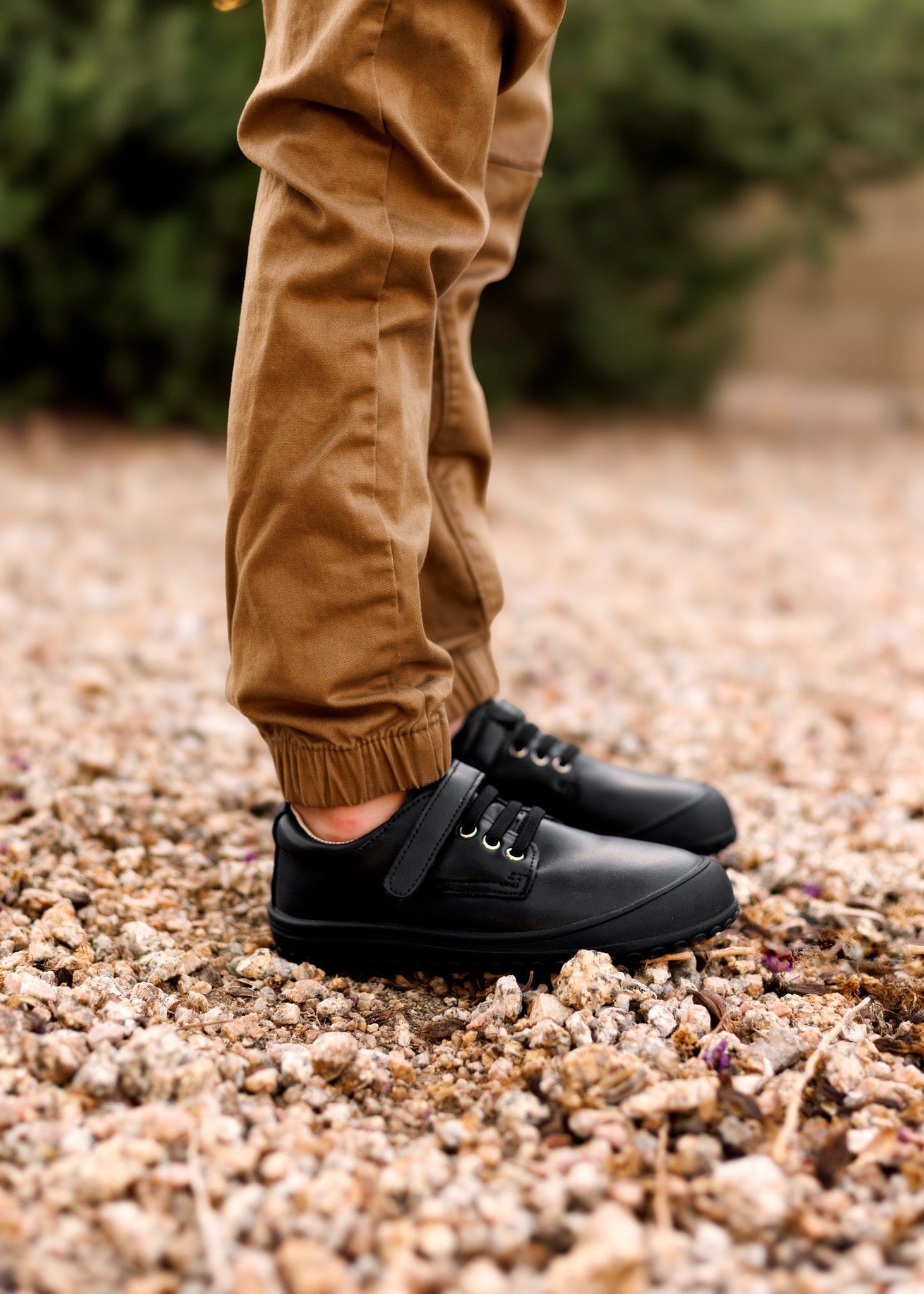 Our Latest Line of Play Perfects! Designed with active school days in mind, these barefoot-style shoes are built to withstand playground adventures. Available in sizes up to children's size 3, they feature a flat, flexible sole, wide toe box, and genuine leather for durability and style.