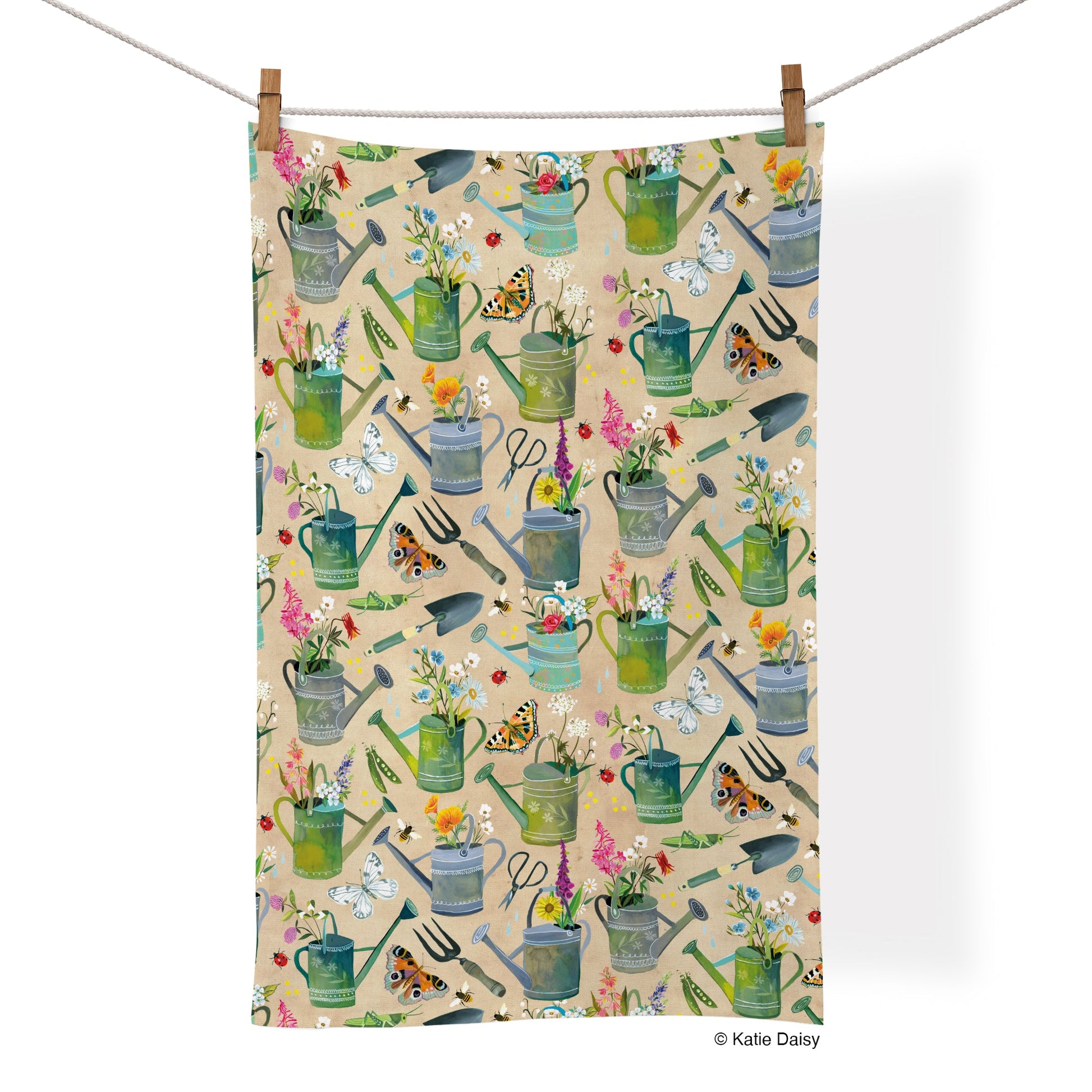 A repeat pattern of watering cans, garden tools, flowers and butterflies make this 100% cotton tea towel a beautiful addition to any gardener's collection of cherished items.
