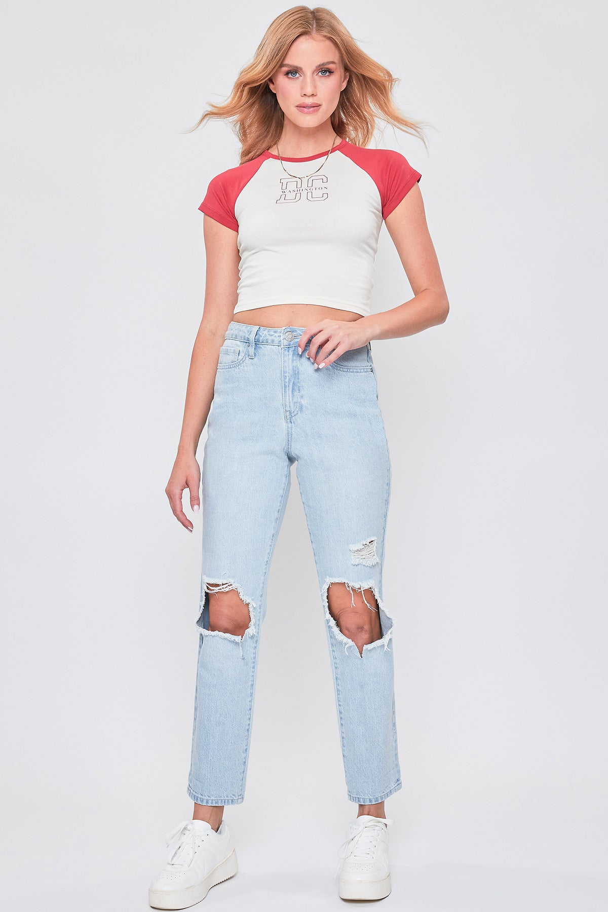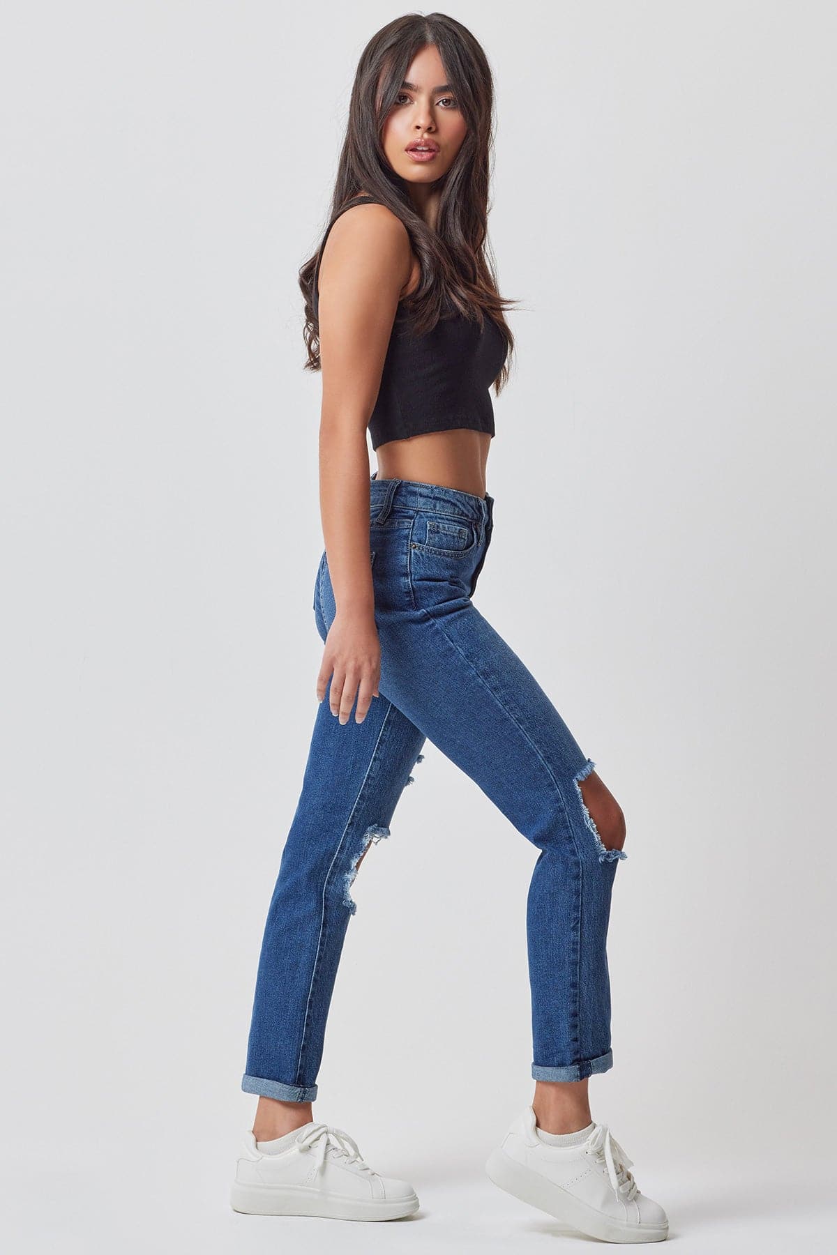 The classic 90s look you love is making a comeback! Our Women's Hybrid Dream High-Rise Mom Fit Ankle Jean gives you that cool 90s nostalgia –but with comfort and stretch! Our Hybrid Dream Denim features a front panel that is 100% Cotton, giving you that perfect rigid denim look, while the back features a butt-hugging and high-stretch denim so you feel just as good as you look. These hit right below the belly button and are narrow in the waist with a bit of give in the hip and a wider thigh. These tapered, ankle-skimming jeans feature knee-blowout details and a cuffed hem. These are an effortless style and pair well with any tank, tee, or blouse!