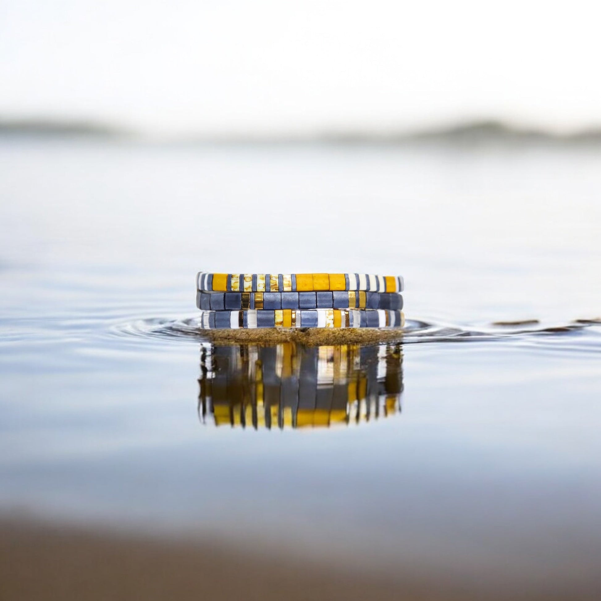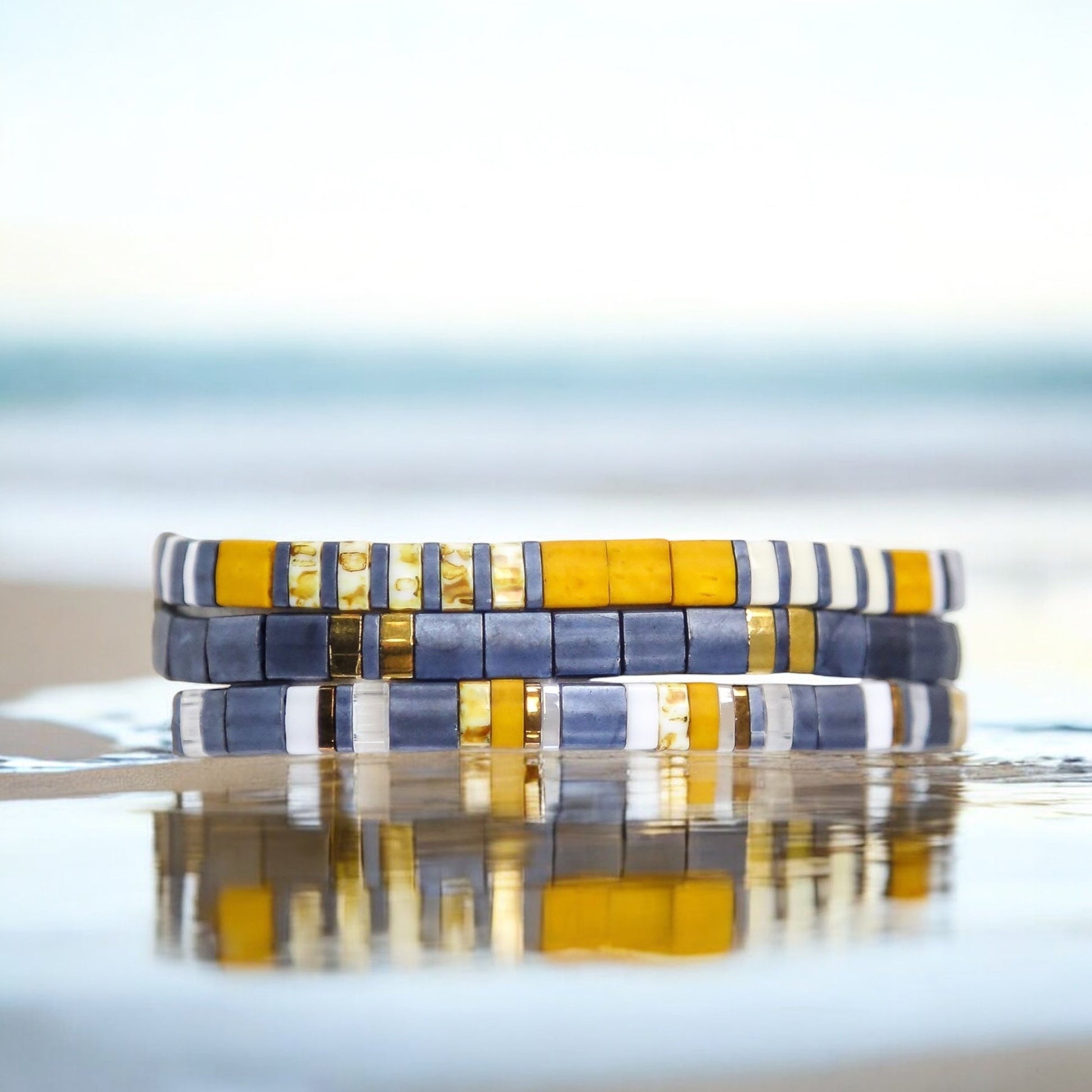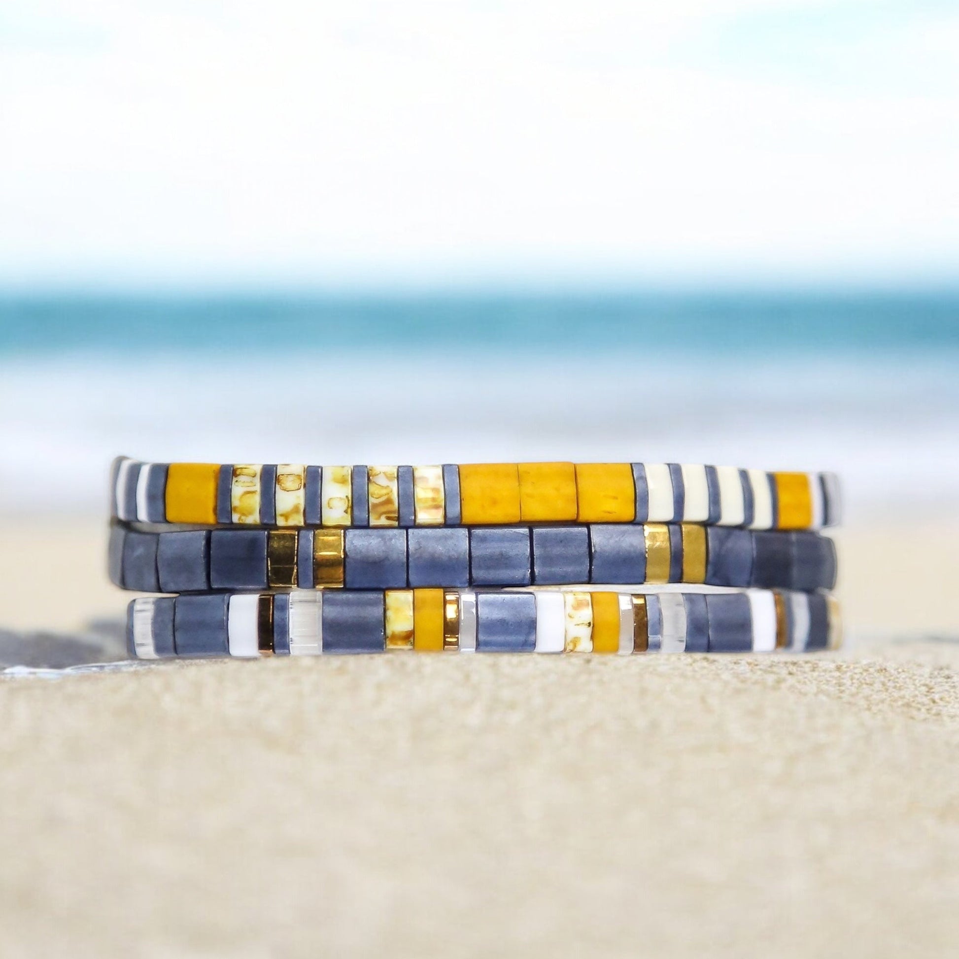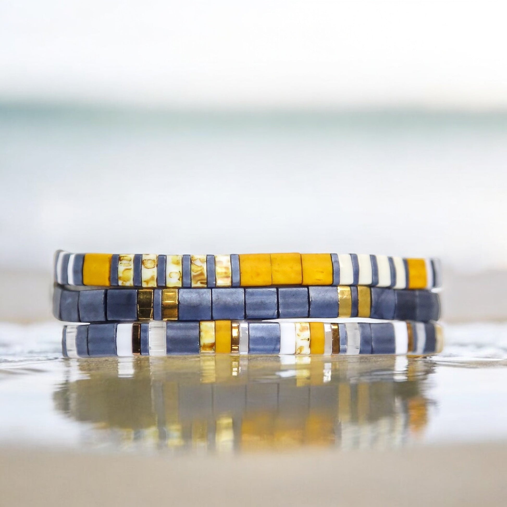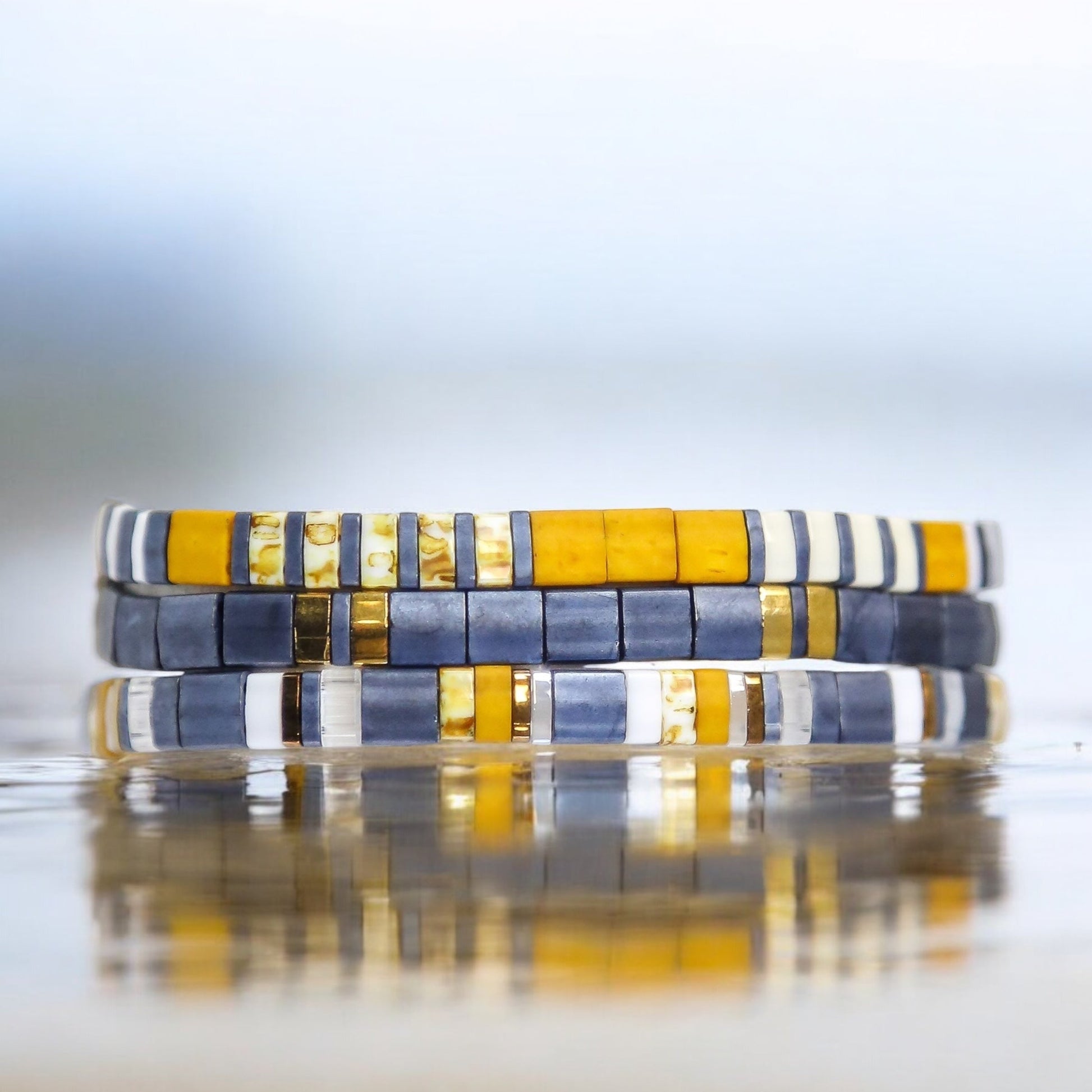 Our YELLOWSTONE stack includes three total bracelets! (Yes, 3!!) Included in the stack are 3 tila bracelets with gorgeous colors of Navy Blue, Orange, White, Bronze and Gold.