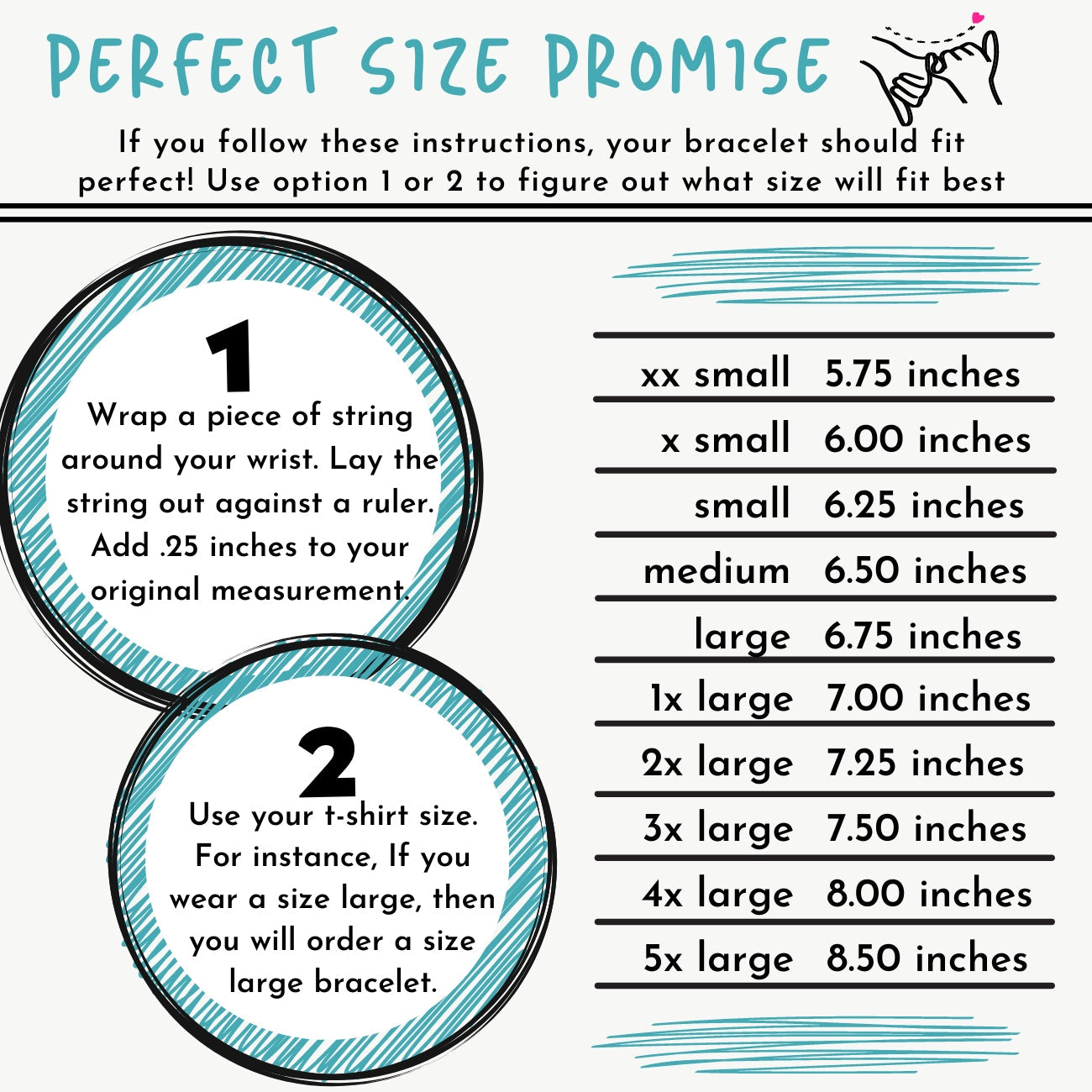 Tila Bracelets aren't your 'typical' tile bracelets. We make the strongest, beaded stretchy bracelets you're going to find! Not only that, but they add a pop of personality to whatever you wear!Our bracelets are waterproof, durable, comfortable, light weight, perfect for layering, and make fantastic gifts! Finding the right size is easy because we've spent years nailing down the PERFECT size and fit for our tila bracelets.PERFECT SIZE PROMISEFriends, we are P.I.C.K.Y. on how your bracelet fits!! If you'll follow these instructions for sizing, you'll get the perfect bracelet size every time! If you’re giving the bracelet as a gift, use option #2.OPTION 1 - Get a piece of string and wrap it around your wrist. Lay the string out by a ruler to figure out what length your wrist is. Once you have that information, you will add .25 to the measurement. For instance: if your wrist measures 7 inches, the size you would want is 7.25OPTION 2 - Use your t-shirt size! Pretty simple, right?! If you wear an extra small t-shirt, you'll get the XS bracelet! (Best to use if you’re giving bracelets as a gift)MENS SIZES – Use #2 for measuring, but size up. For instance, if you wear a 1X shirt, you will wear a 2X bracelet.PLEASE NOTE: 4XL and 5XL sizes are available on most bracelets, but not all bracelets.FAQ: How do you know if your bracelet is the perfect fit? Your bracelet should stay in one place on your wrist, but be able to easily twist around from left to right without much effort. The bracelet should barely move up and down your arm, and may not even move at all. Your bracelet should feel contact with your wrist, but shouldn’t hang either. The bracelet should also lie flat to your wrist.Share
